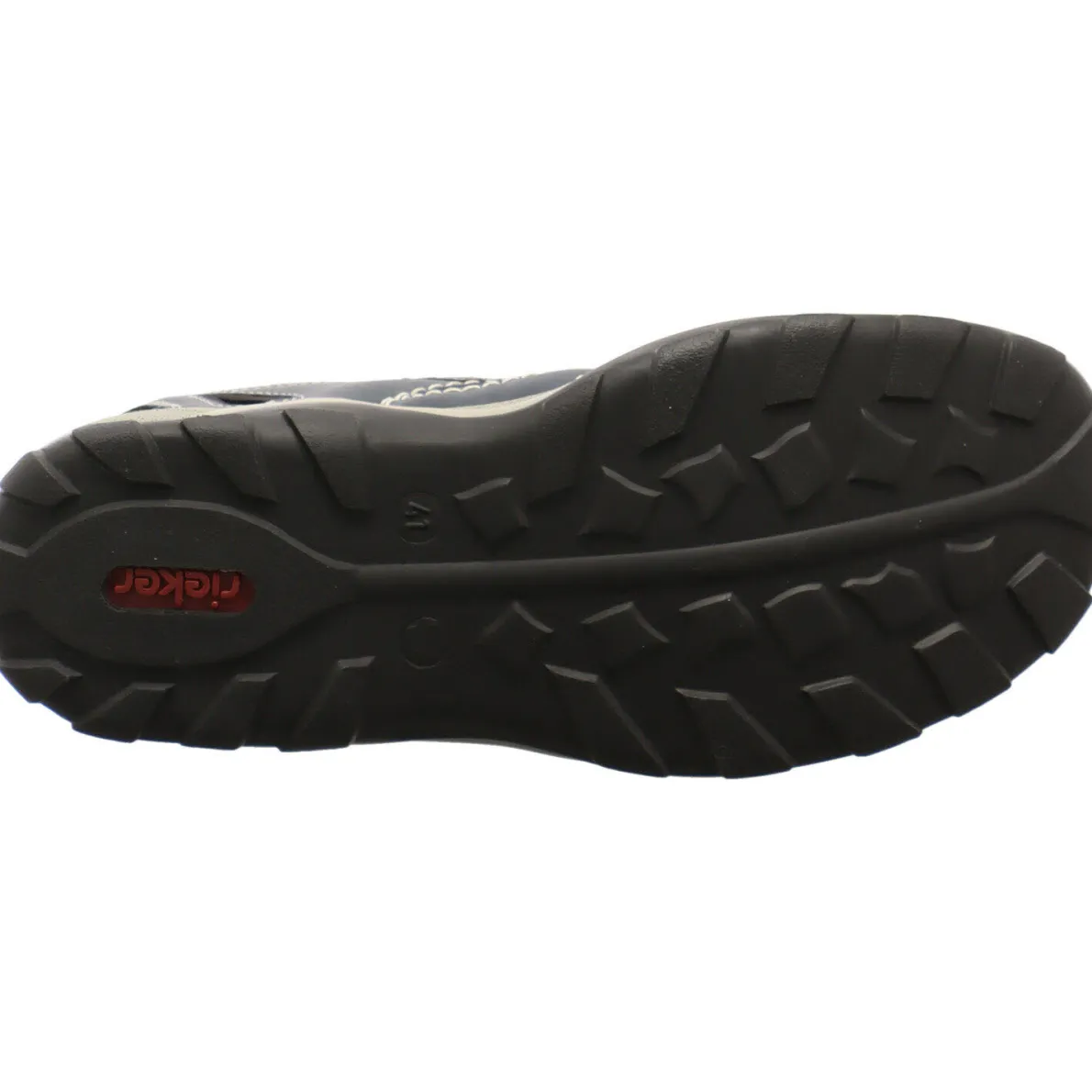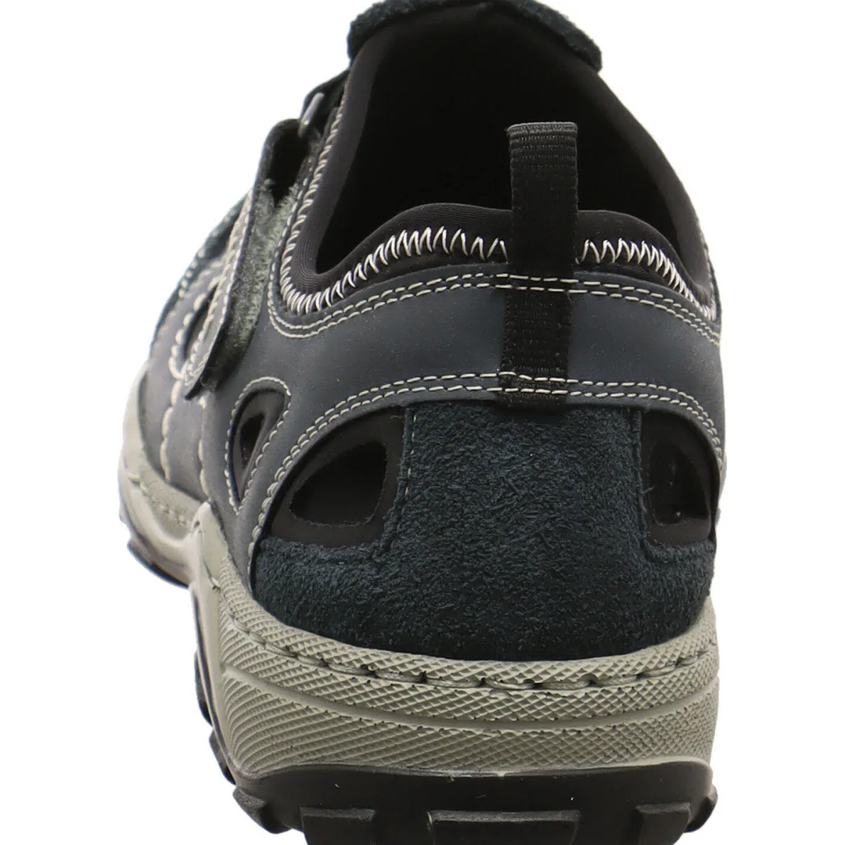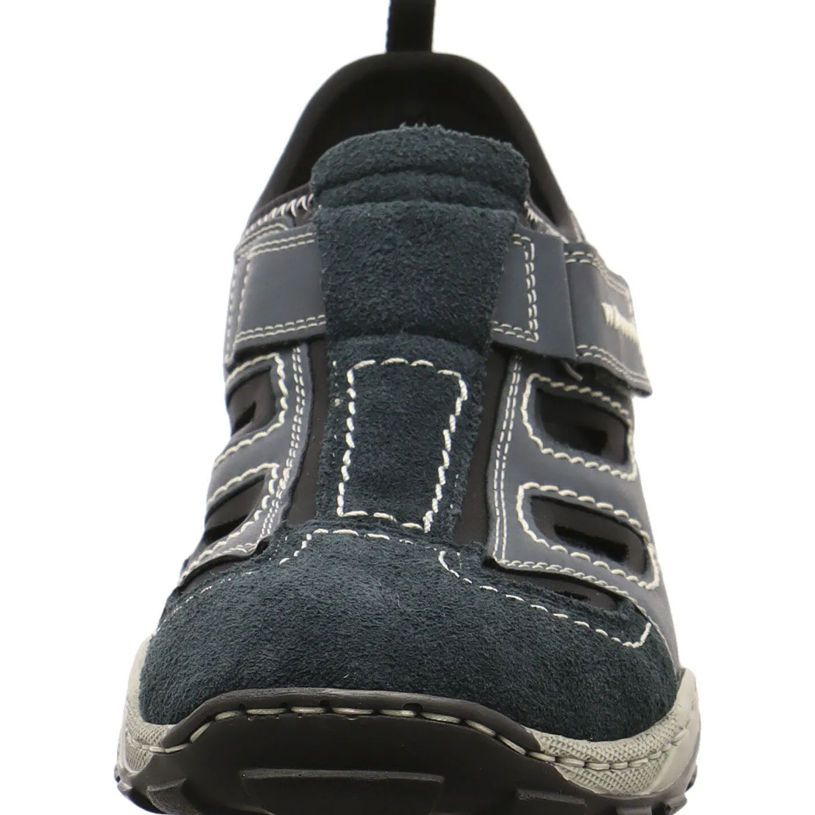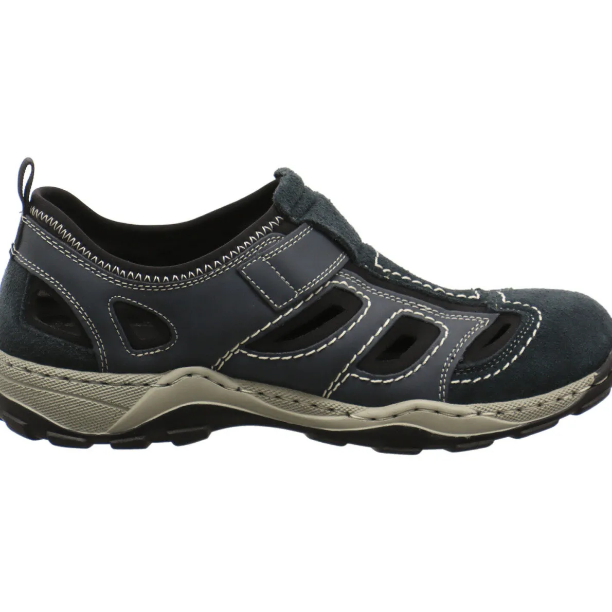 Dieser sportive Slipper von Rieker aus Kunstleder in blau besticht in erster Linie durch sein aktuelles Trekking-Design mit Luftdurchlässen an den Seiten, die ein optimales Fußklima garantieren.