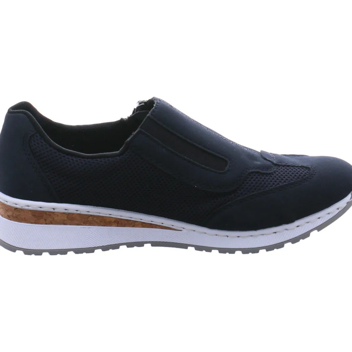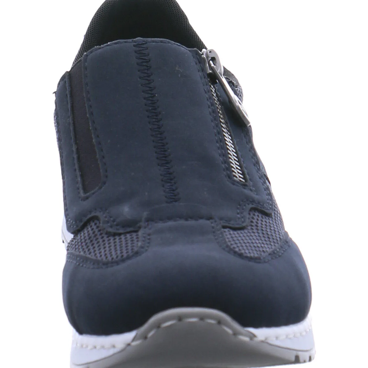 Dieser sportliche Damen Slipper in Blau aus dem Hause Rieker wurde aus Kunstleder mit Nubukleder Haptik gefertigt und mit einem Dehngummi und einem Reißverschluss versehen. Die weich gepolsterte AntiStress Soft Innensohle ist angenehm gepolstert und mit Cutouts versehen, welche für ein optimales Klima sorgen. Die Innensohle ist als Wechselfußbett gearbeitet, so können auch eigene Einlagen verwendet werden.