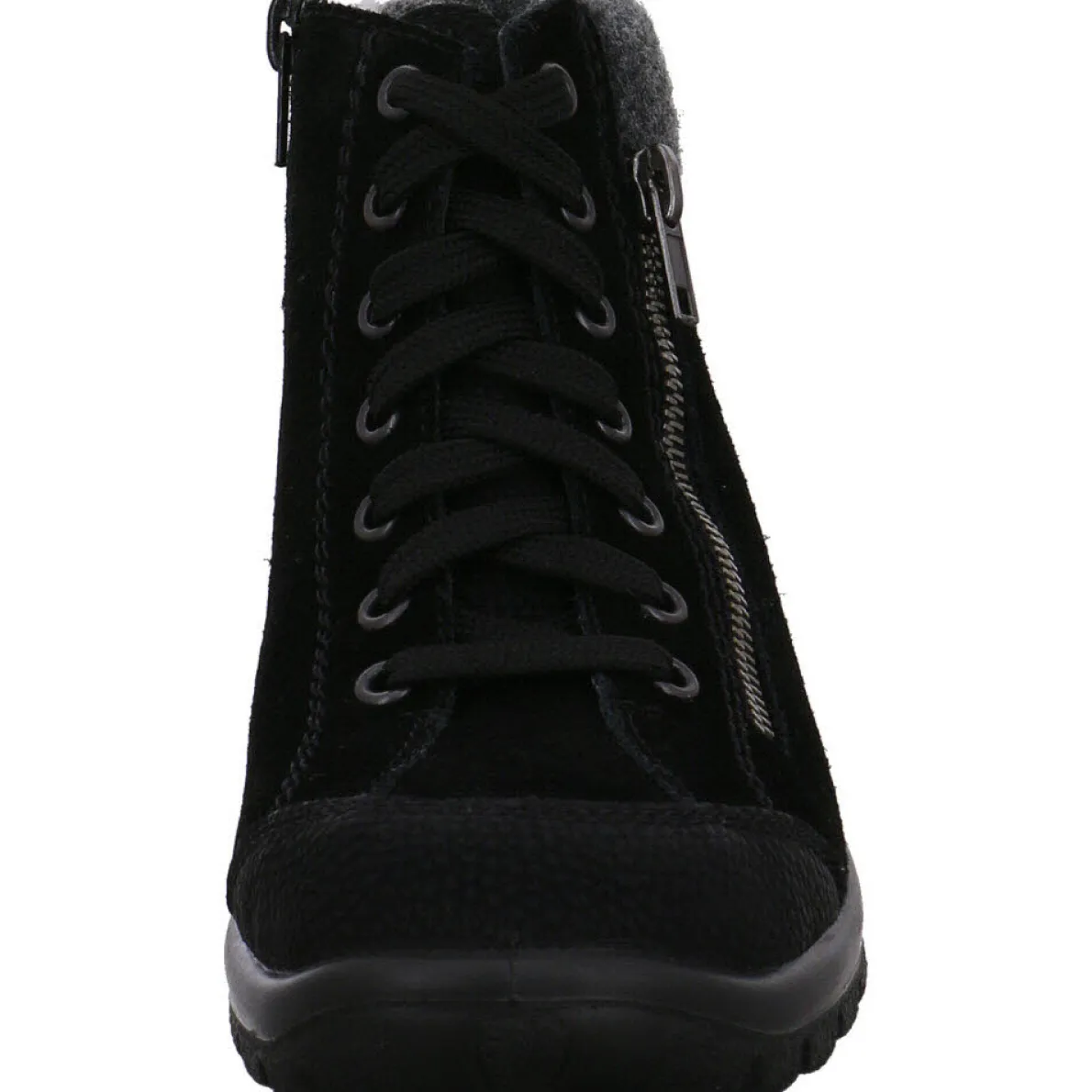 Dieser Winter Sneaker für Damen ist ein stylischer und komfortabler Begleiter für die kalte Jahreszeit von Rieker. Gefertigt aus hochwertigen Velours- und Kunstleder in Schwarz überzeugt er mit dem schlichten Design und lässt sich dadurch super zu jedem Outfit kombinieren. Die Highlights des Schuhs sind der Zierreißverschluss neben der Schnürung und der Schaftrand aus Filz in Grau.