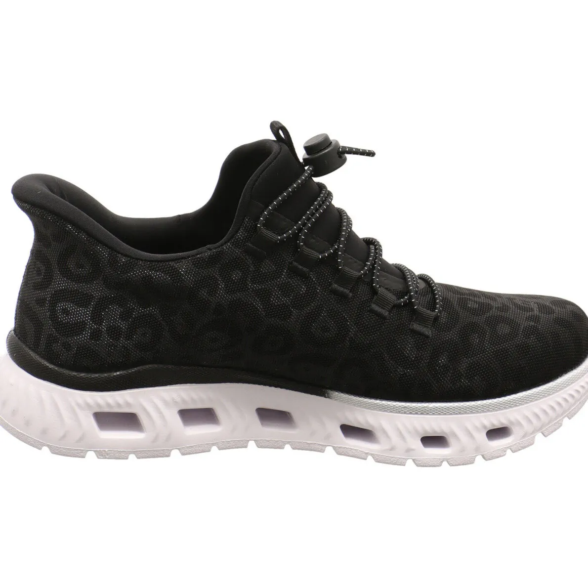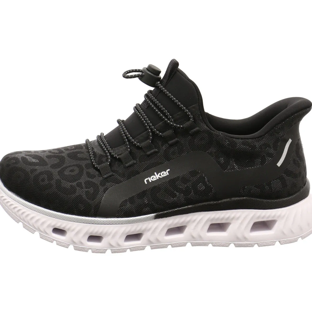Das Obermaterial aus Textil in Schwarz ist mit einem Animal Leo Print versehen, der im Licht toll zur Geltung kommt und schimmert. Der Schaft ist mit Strtech gearbeitet und etwas höher gezogen, wodurch du ganz leicht in den Schuh kommst und einen super halt darin hast. Mit der Automatikschnürung kannst du die Passform auf deinen Fuß abstimmen. Die Rieker Soft Innensohle ist angenehm weich und passt sich deiner Fußform an.