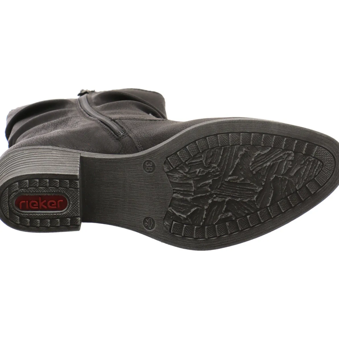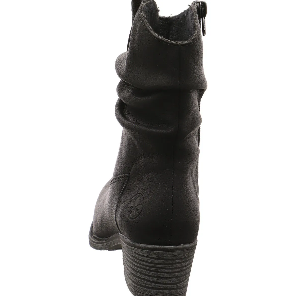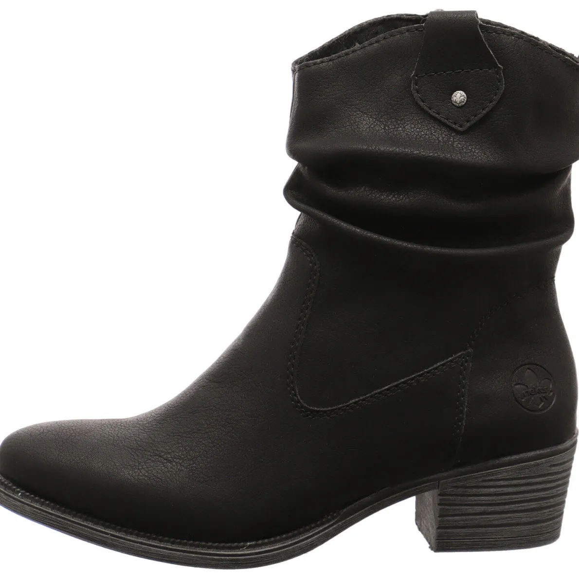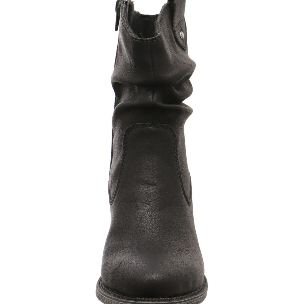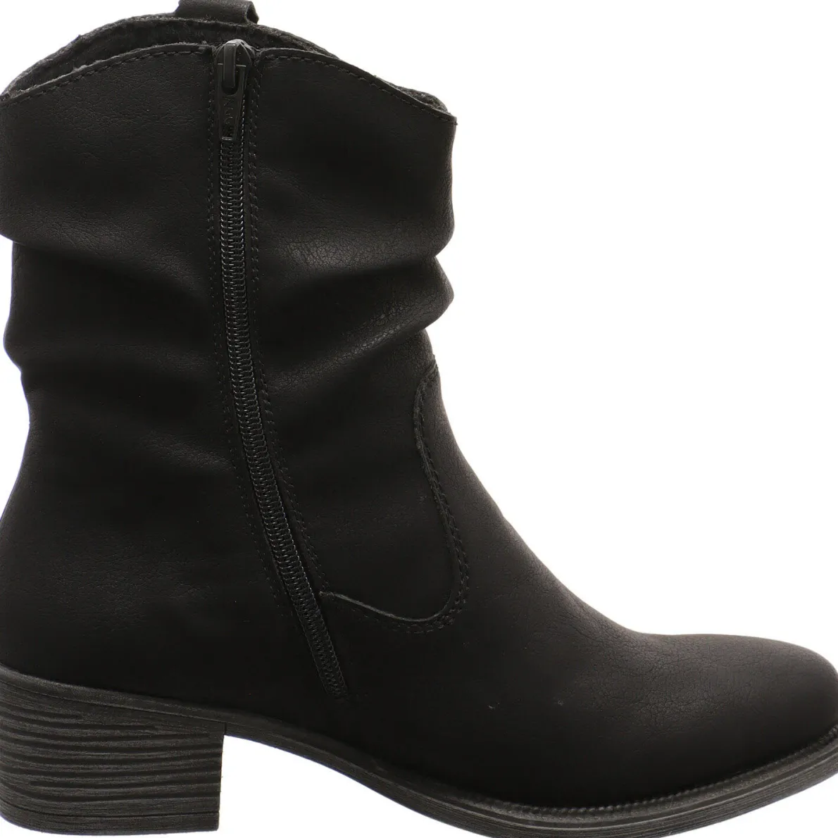 Das Obermaterial aus Kunstleder in Schwarz ist am Schaft in Falten gelegt. Ein kleiner Zierriemen mit Niete passt perfekt zum Design.