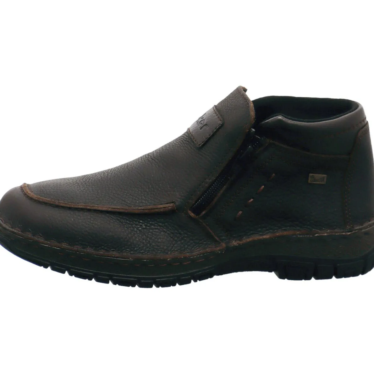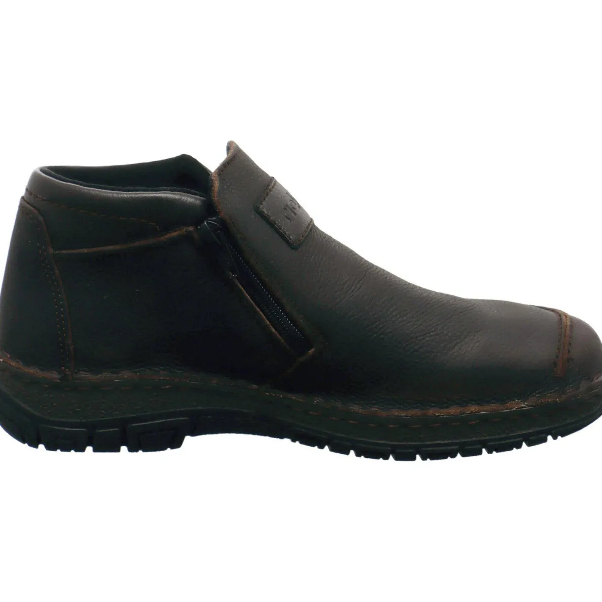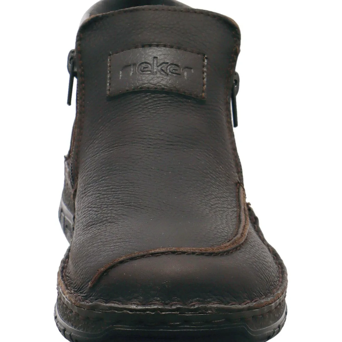 Gefertigt aus grob genarbtem, hochwertigem Echtleder in dunklem Kastanien Braun ist der Schuh mit tonalen Ziernähten und einer groben Naht auf dem Blatt versehen. Durch den doppelten Reißverschluss ist ein leichter Ein- und Ausstieg möglich. Die am Schaft angebrachte Ziernaht gibt dem sonst eher schlichten Schuh eine besondere Note. Der Schaft ist angenehm gepolstert und die Stiefelette ist mit der Rieker Tex Ausstattung versehen, welche sie wasserabweisend und atmungsaktiv macht.