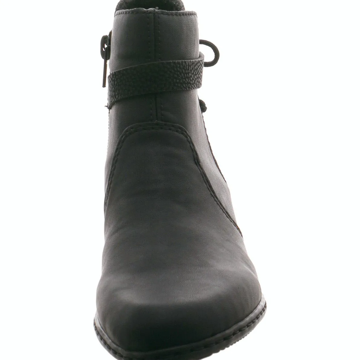 Schlicht und elegant kommt diese Rieker Damen Stiefelette daher, die mit angenehm griffigen Kunstleder in Schwarz überzeugt. Eyecatcher ist dabei der Zierriemen um den Knöchel. Mit der patentierten Antistress Sohle ist immer höchster Tragekomfort gegeben, denn sie ist besonders leicht und flexibel. Das wärmende Innenfutter lässt Sie auch bei niedrigen Temperaturen nicht im Stich und der Reißverschluss ermöglicht einen komfortablen Ein- und Ausstieg.