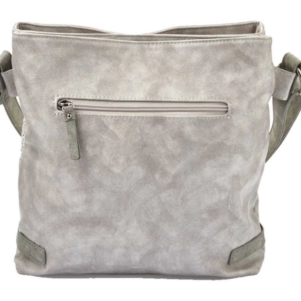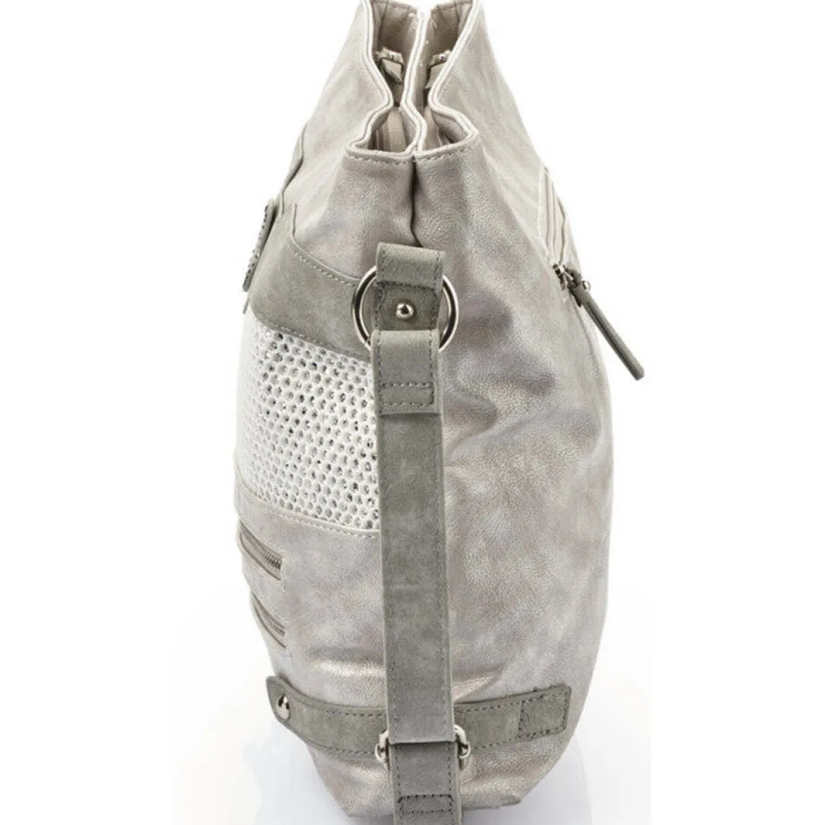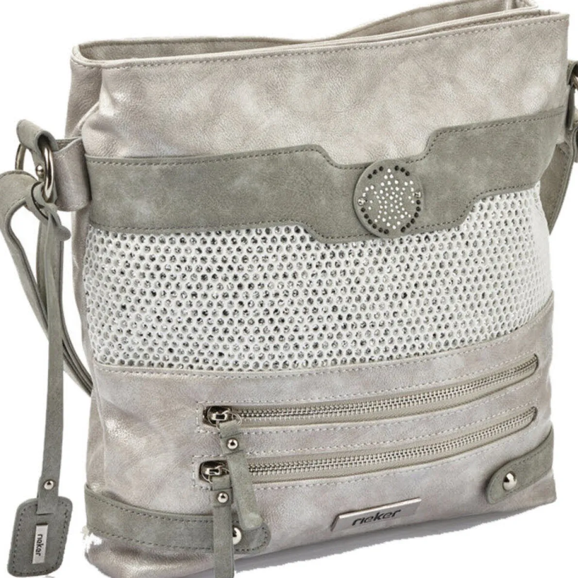 Diese schicke Umhängetasche für Damen von Rieker überzeugt durch ihr extravagantes Design. Gefertigt aus hochwertig verarbeitetem Kunstleder in Grau, im Metallic Look, ist sie ein Must-have für die kommende Saison. Ein besonderer Hingucker ist die Wabenstruktur im Glitzer Look und die Lilie mit Strasssteinen auf der Vorderseite.