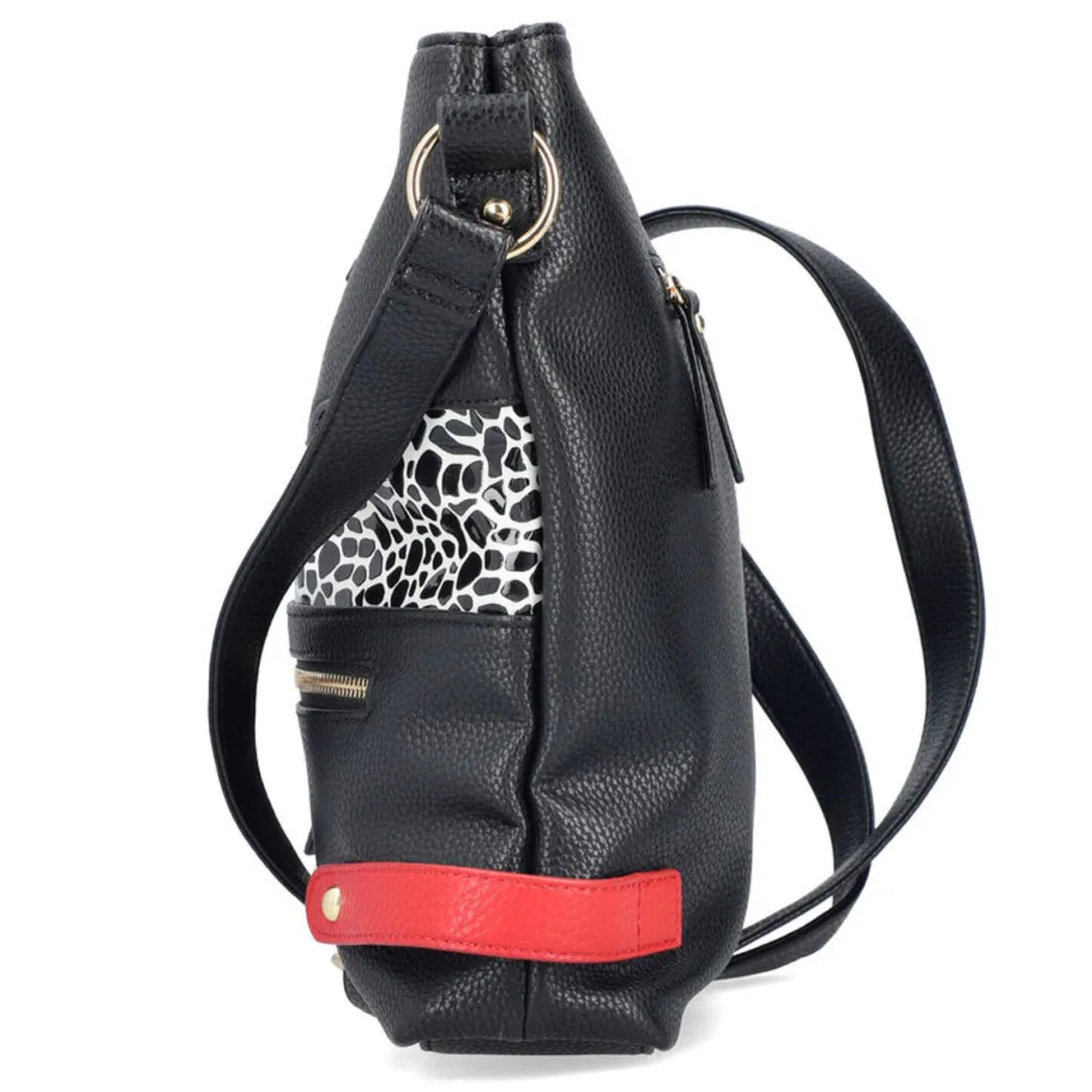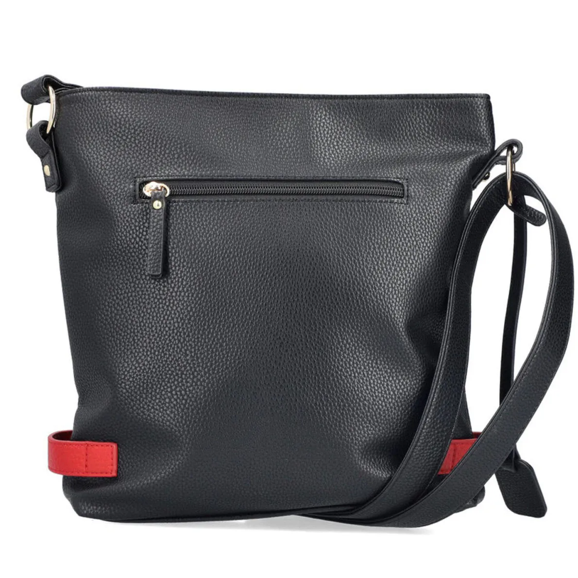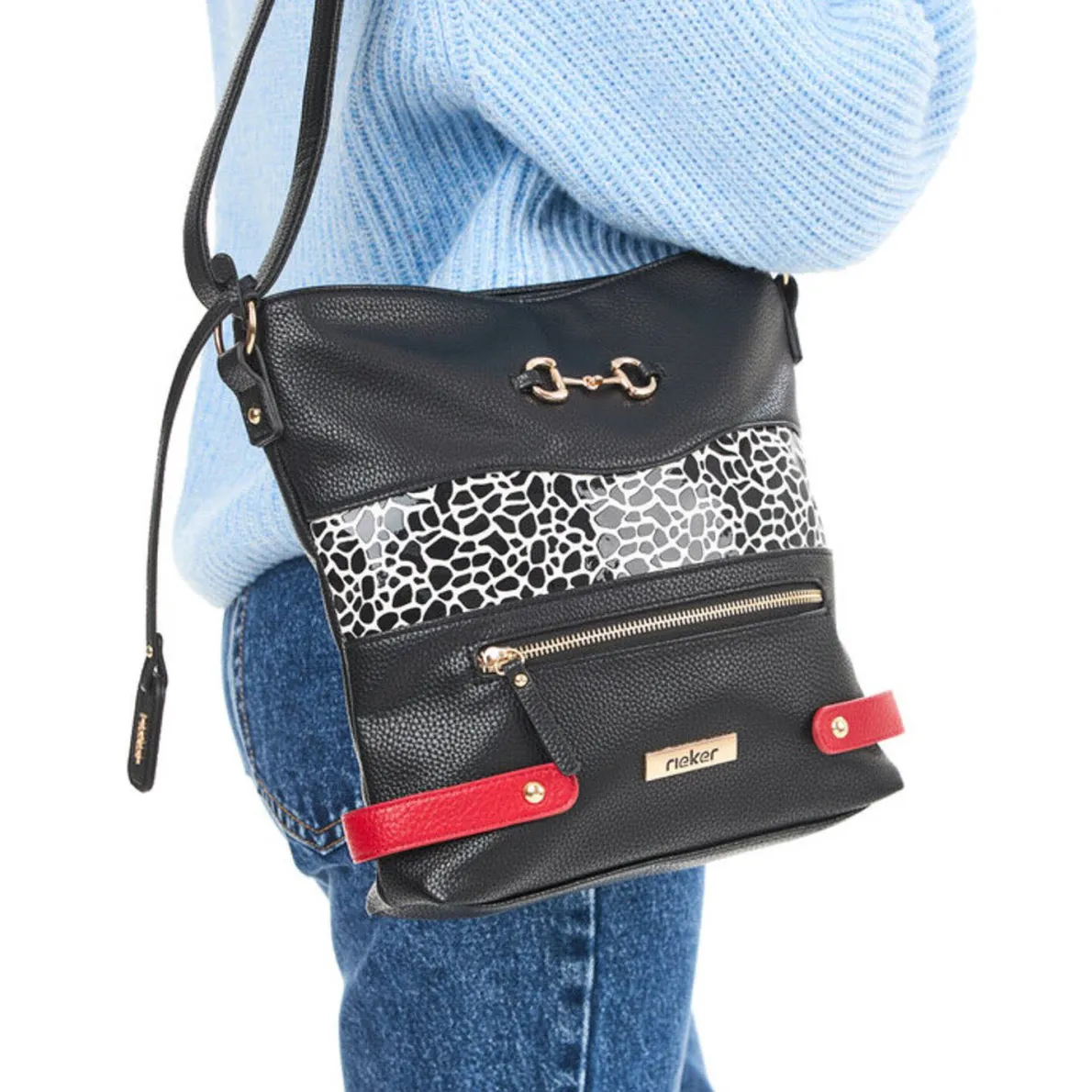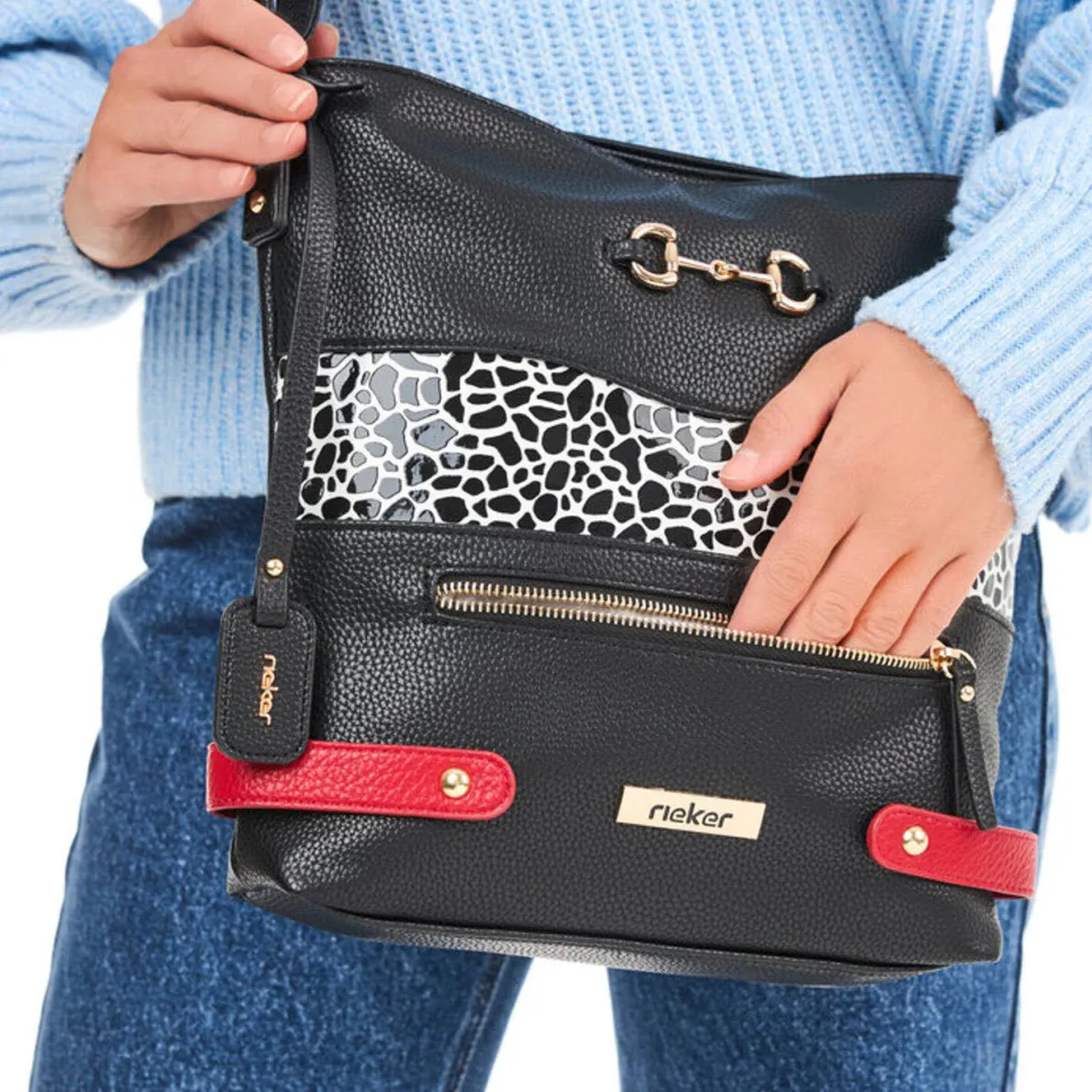 Diese schicke Umhängetasche für Damen von Rieker überzeugt durch ihr extravagantes Design. Gefertigt aus hochwertig verarbeitetem Kunstleder in Schwarz ist sie ein Must-have für die kommende Saison. Ein besonderer Hingucker ist der schwarz-weiße Animal Streifen und die Details in Gold und Rot auf der Vorderseite.