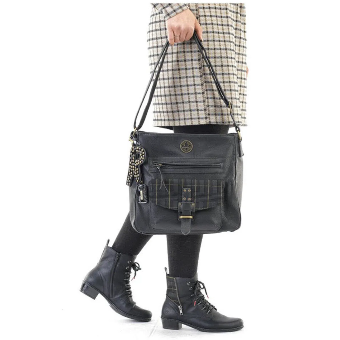 Gefertigt aus trendigem und authentisch genarbtem Kunstleder in Schwarz wird die Handtasche zum absoluten Lieblingsstück. Modisches Highlight ist die kleine aufgesetzte Tasche mit Karo Muster und der mit Nieten versehene Anhänger.