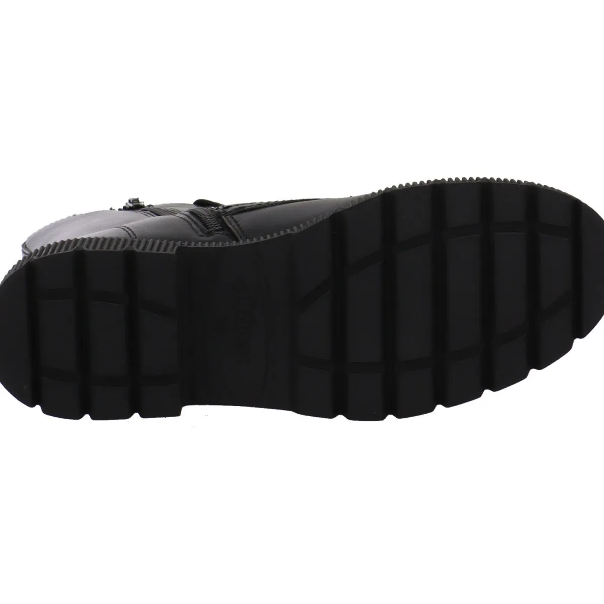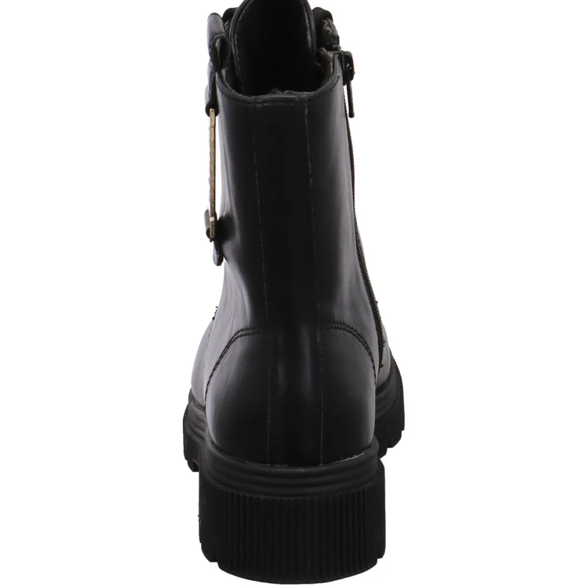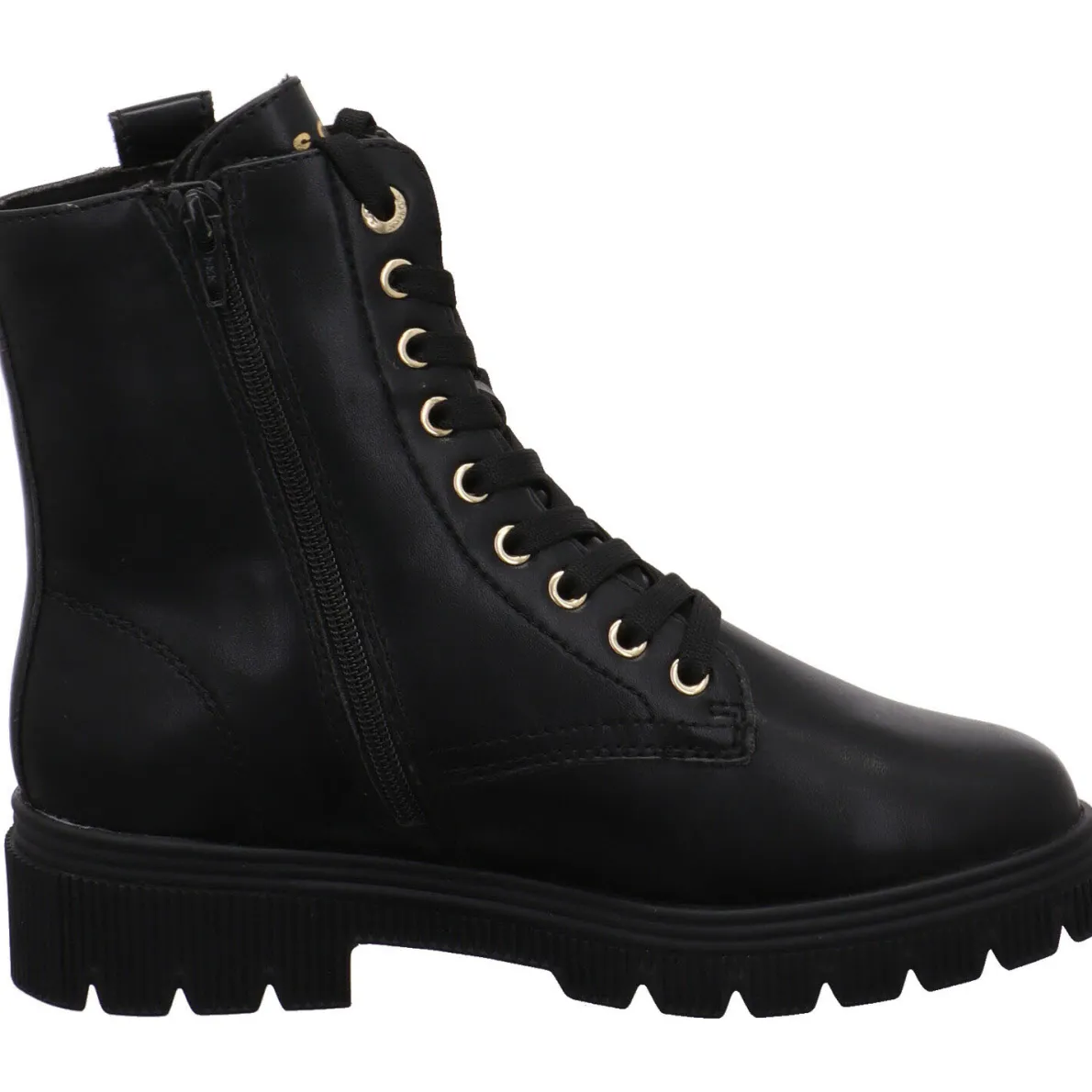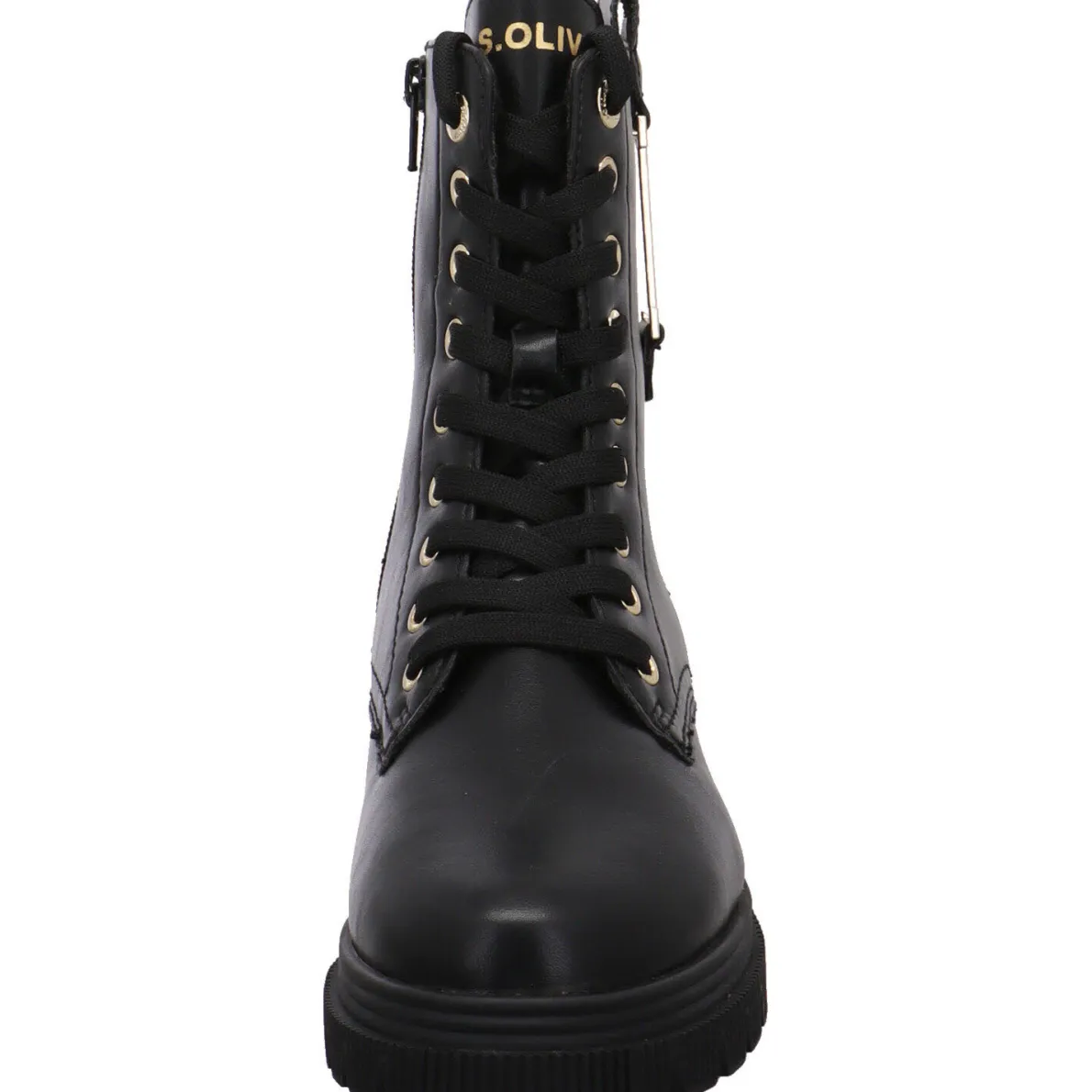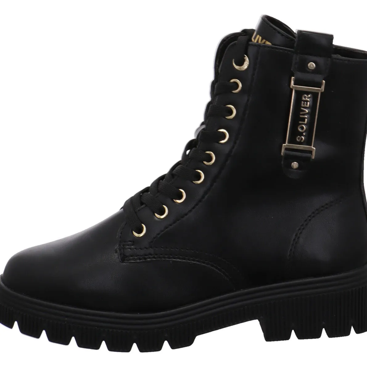 Er wurde voll vegan aus Kunstleder in Schwarz gearbeitet und ist an der Außenseite vom Schaft mit einer kleinen Zierschnalle mit dem s.Oliver Logo in Gold versehen. Die Schnürsenkelösen sind Gold abgesetzt und passen perfekt zum Look.