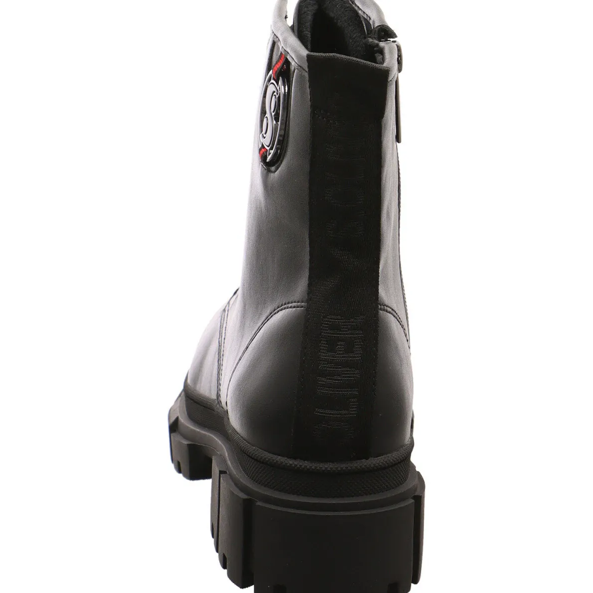 Gefertigt aus Kunstleder in Schwarz, ist er am Schaft mit einer schönen Metall Applikation verziert. Dank dem Textil Band an der Rückseite vom Schaft, auf dem sich das Markenlogo befindet und dem seitlichen Reißverschluss, ist der Einstieg ganz einfach.