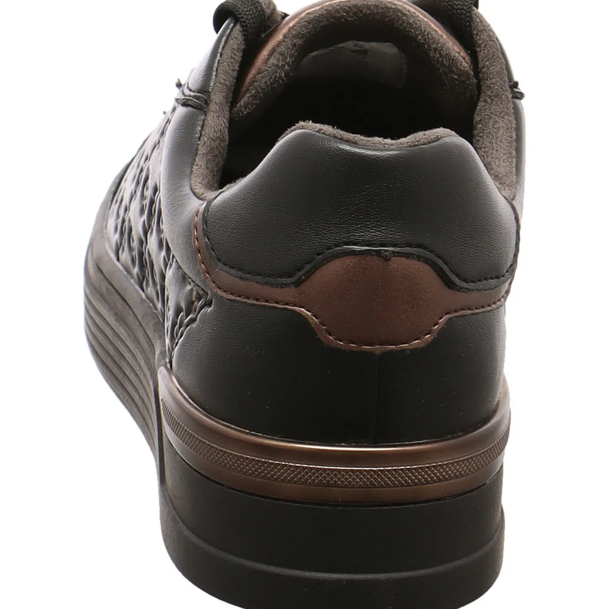Das Obermaterial wurde aus Kunstleder in Schwarz gefertigt. Highlight ist dabei die seiltiche Prägung mit Farbakzenten in Braun.