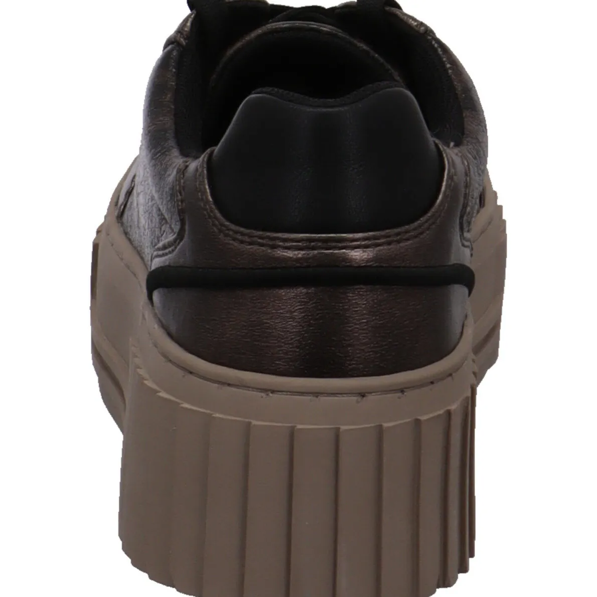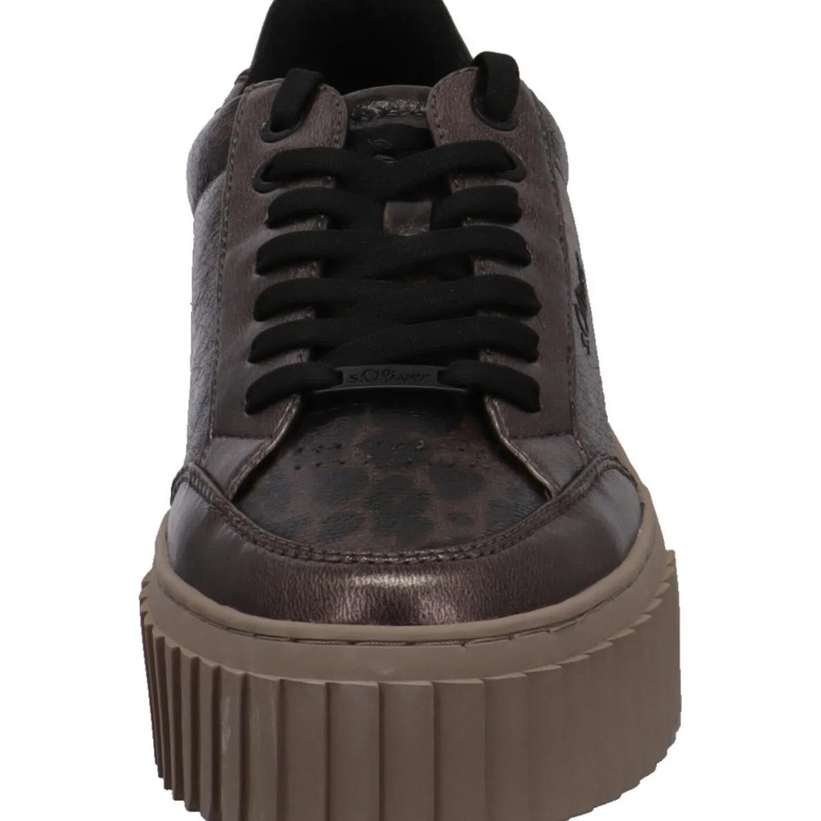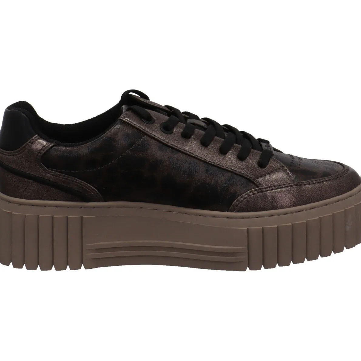 Das Obermaterial aus pflegeleichtem Kunstleder in Bronze Braun ist mit einem trendigen Animal Leo Print überzeugt versehen. Die Metallic Optik und diemoderne, strukturierte Plateausohle unterstreichen das Design zusätzlich.