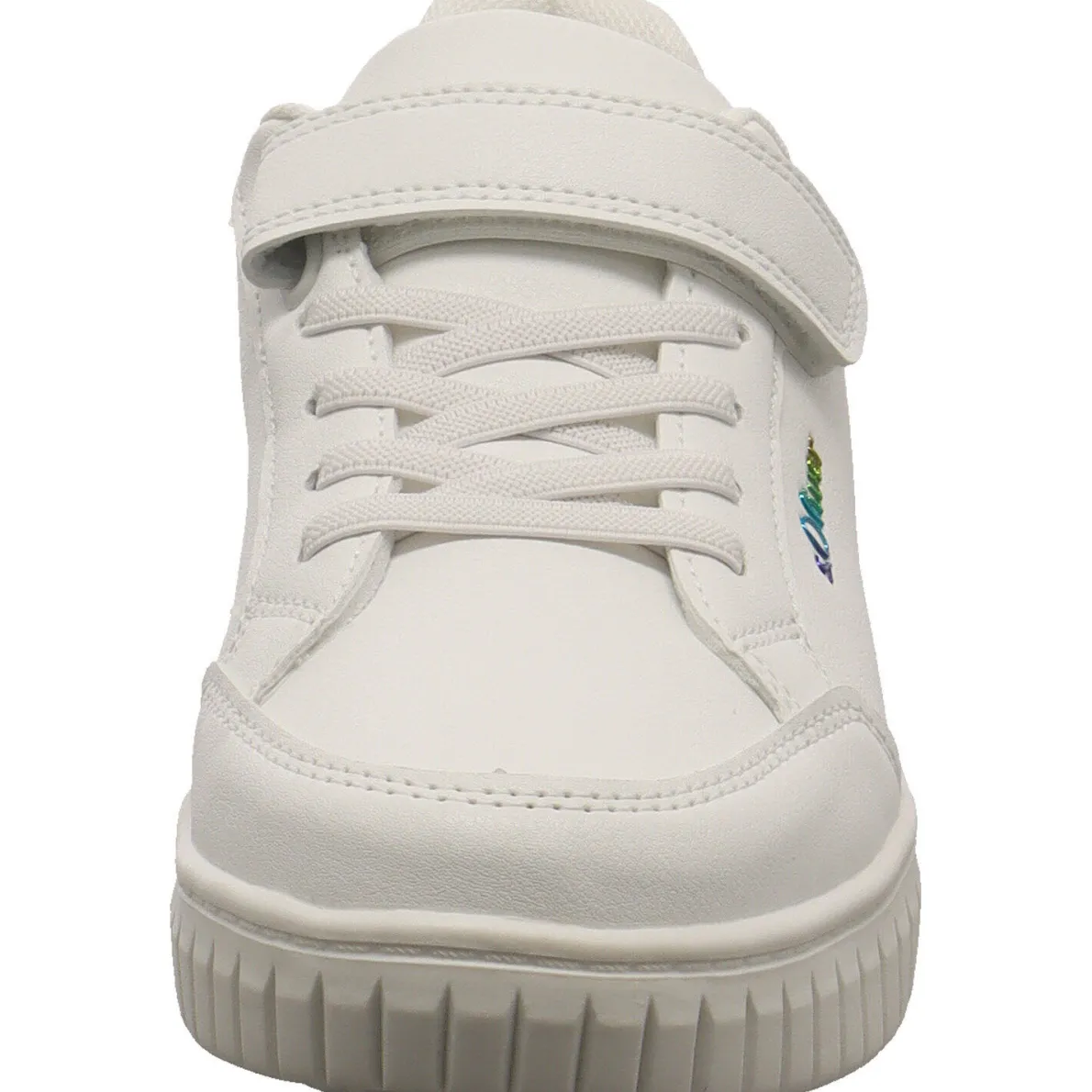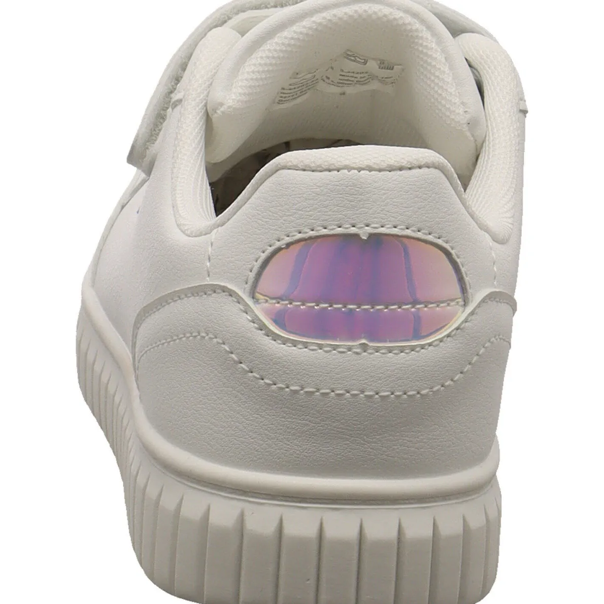 Es wurde aus Kunstleder in Weiß gefertigt und begeistert sofort durch das Markenlogo in Regenbogenfarben an der Seite und den schimmernden Einsatz an der Ferse. Der Schaft ist angenehm weich gepolstert und durch die Gummischnürung und den Klettverschluss ist der Einstieg ganz einfach.