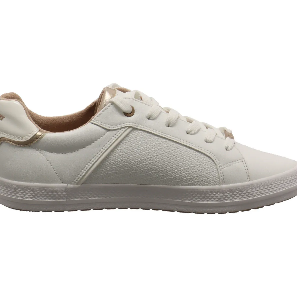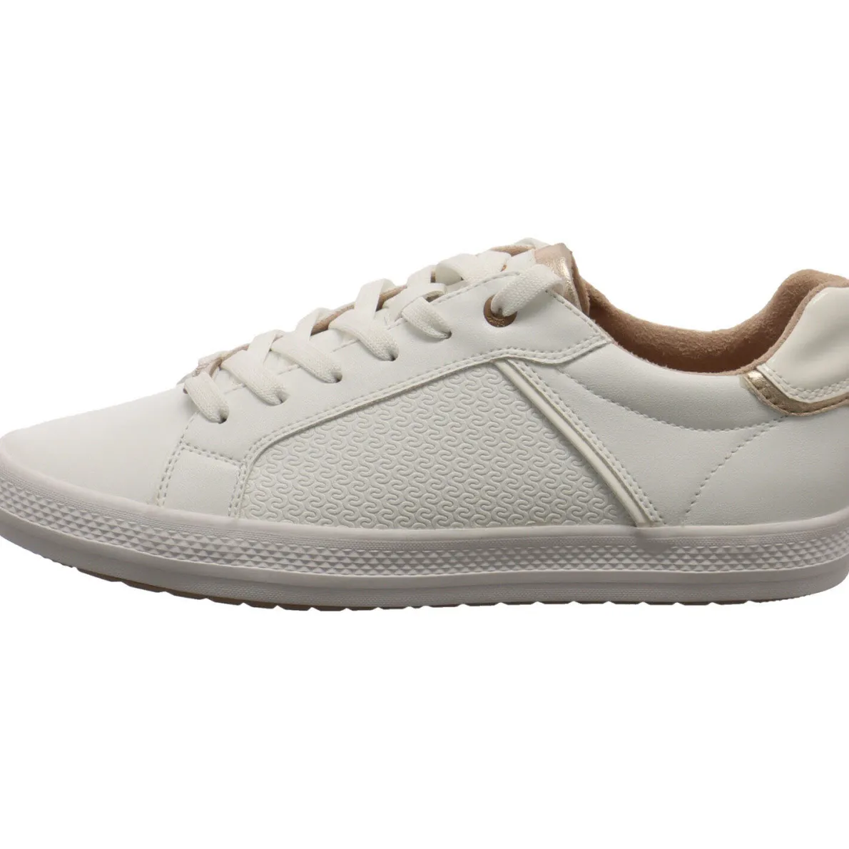 Das Obermaterial aus Kunstleder in Weiß, wird durch die Details in Rose Gold gekonnt in Szene gesetzt.