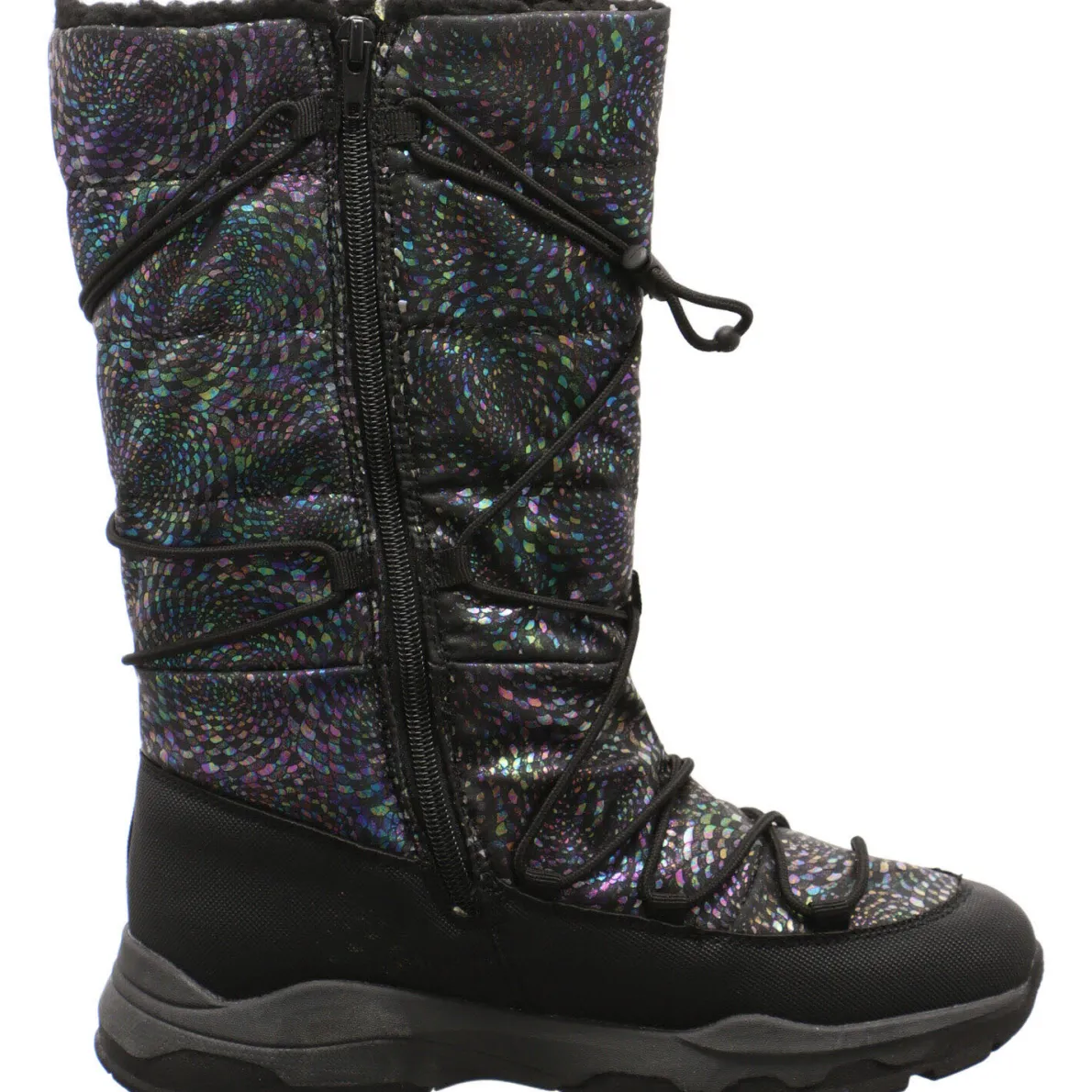 Ein besonders schicker und dennoch funktioneller Stiefel für Mädchen ist dieses Modell von s.Oliver. Gefertigt aus einem Mix aus pflegeleichtem Kunstleder und Textil in Schwarz ist er mit mit einem grafischen Muster in vielen schimmernden Farben am Schaft verziert. Die Schuhspitze und Ferse sind verstärkt und dadurch besonders robust.