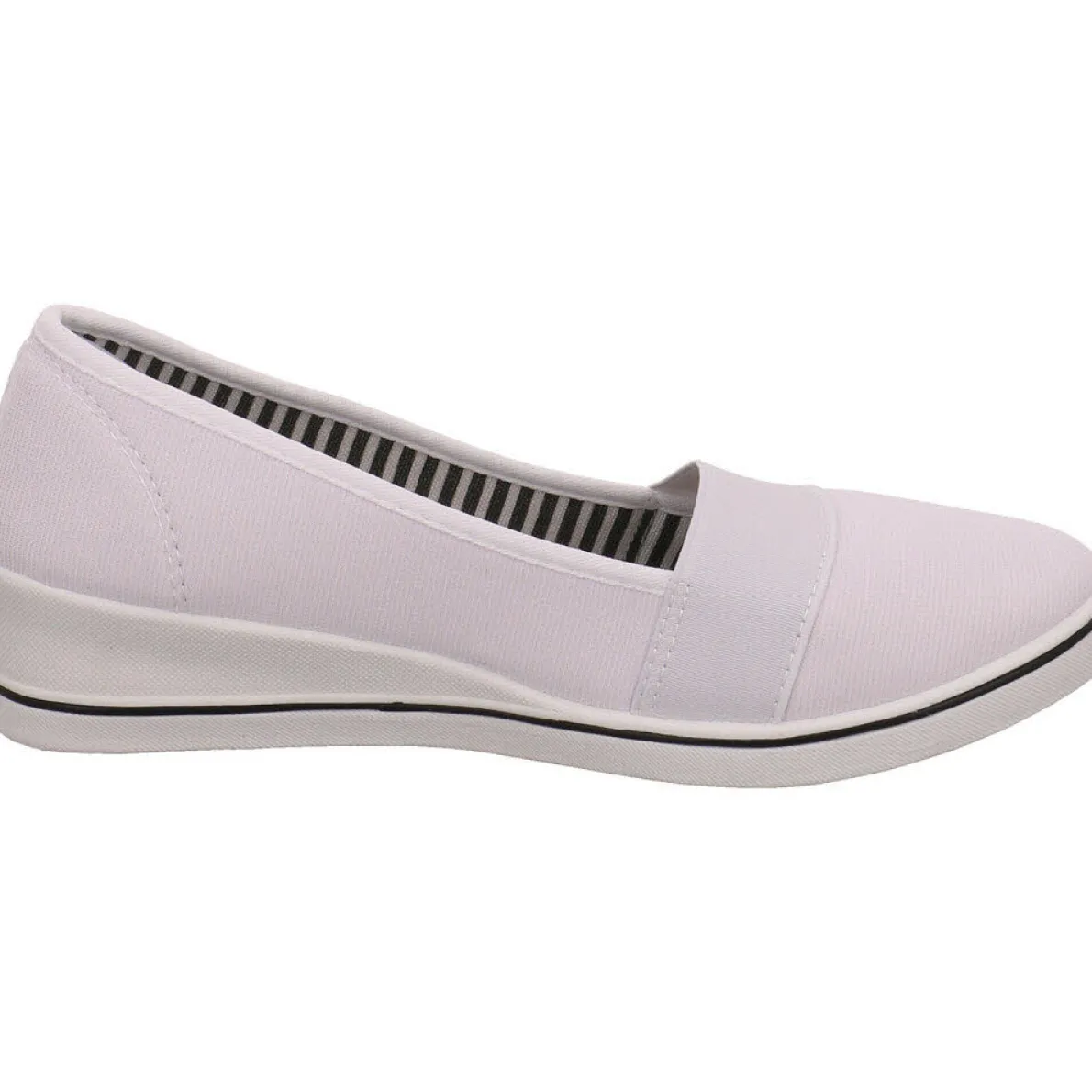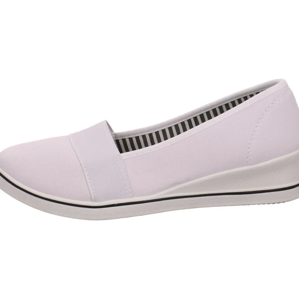 Das Obermaterial aus Textil im Candas Look in Weiß ist robust und langlebig und verleiht dem Schuh einen sportiven Look. Die Umrandung in Schwarz des flachen Keilabsatz in Weiß gibt dem Pumps eine ganz besondere Optik. Zudem sorgt der breite Dehngummi über dem Spann für einen leichten Ein- und Austieg.