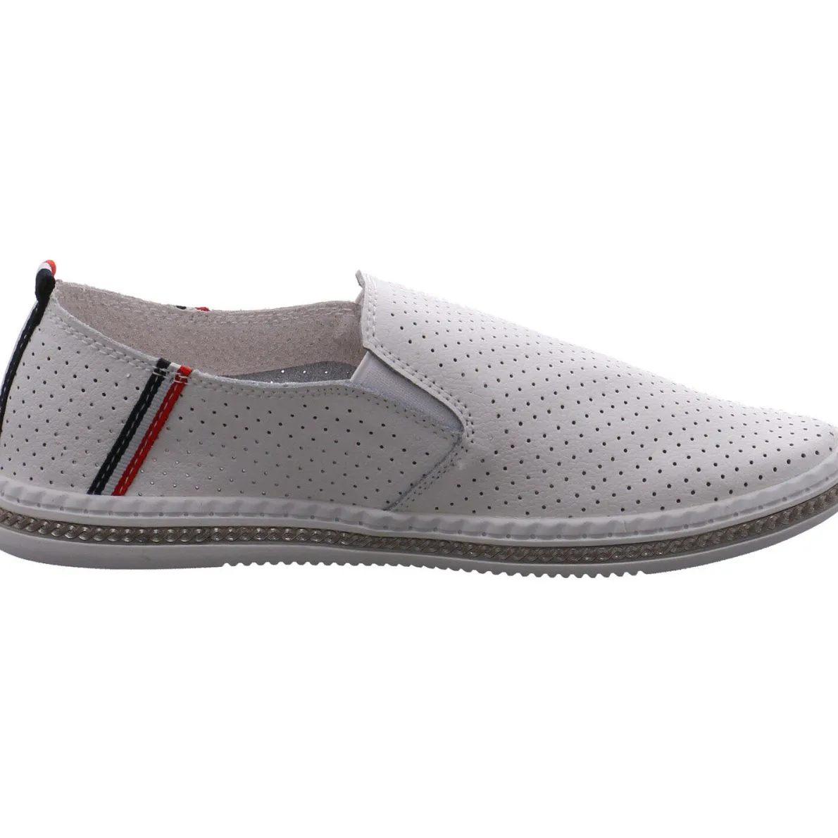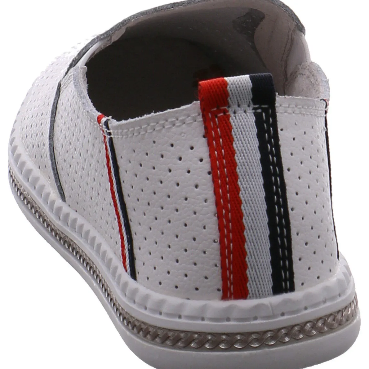 Der Schuh ist mit kleinen Lasercuts und Streifen in Rot, Weiß und Blau verziehrt. Ein besonderes Highlight ist der metallische Schmuckstreifen um die Laufsohle herum.