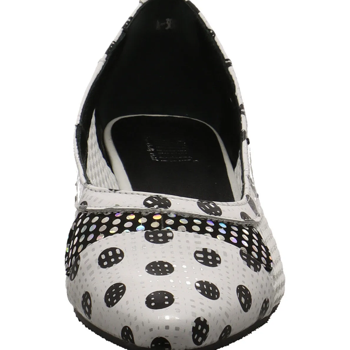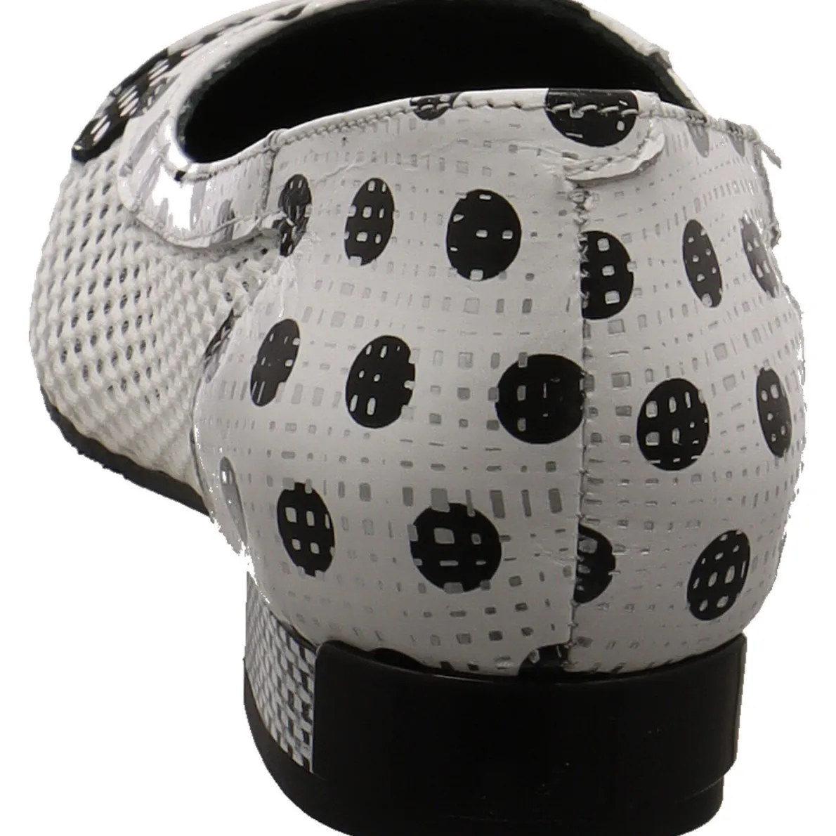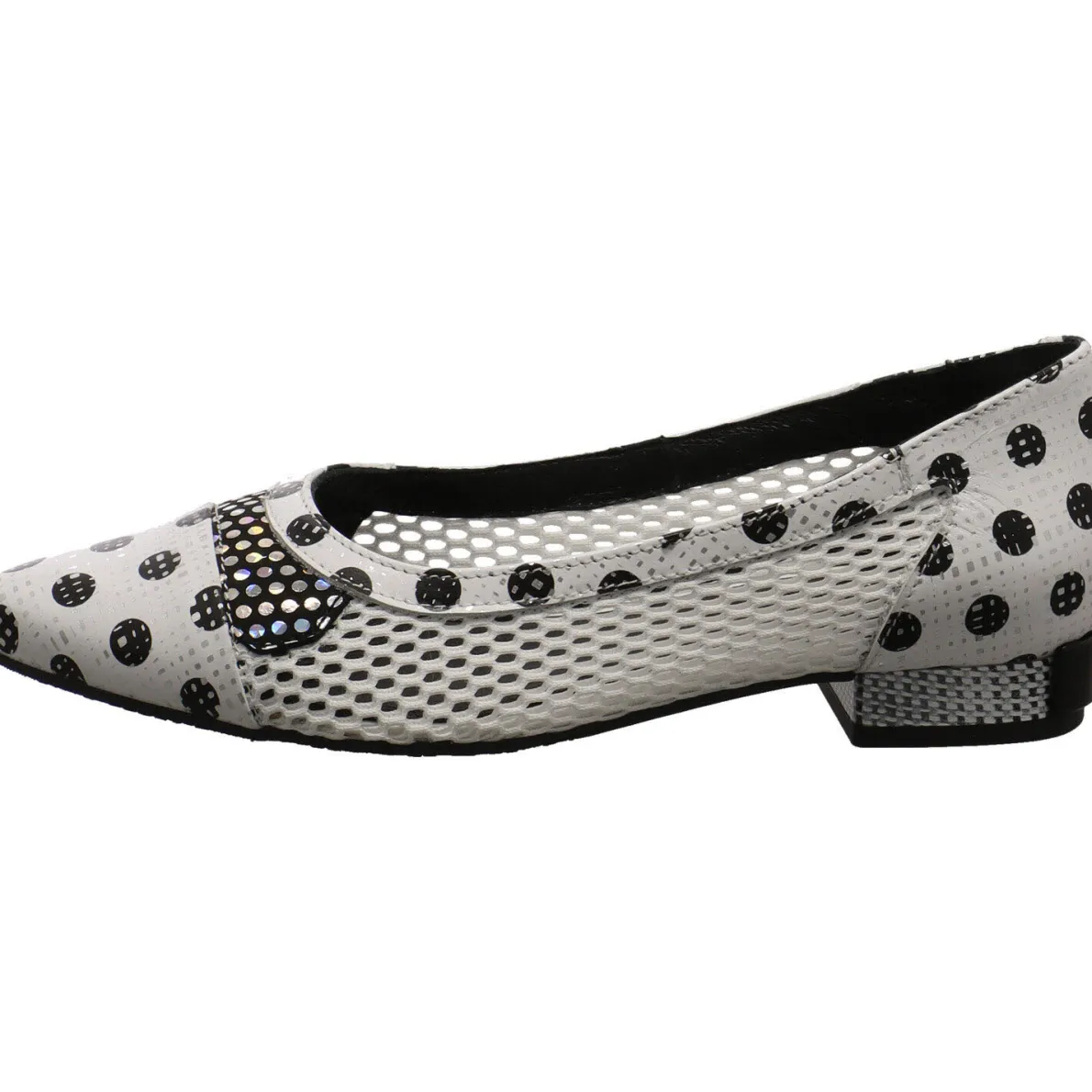 Mit diesem Damen Ballerina liegst du diesen Frühling und Sommer voll im Trend. Dieses Modell von Simen wurde aus hochwertigem Echtleder in Weiß gearbeitet und mit Punkten in Schwarz verziert. Die Netz Optik an den Seiten, sorgt auch an warmen Tagen für ein angenehmes Gefühl im Schuh. Die Innensohle ist angenehm weich gepolstert und macht den Schuh zum idealen Begleiter ins Büro.
