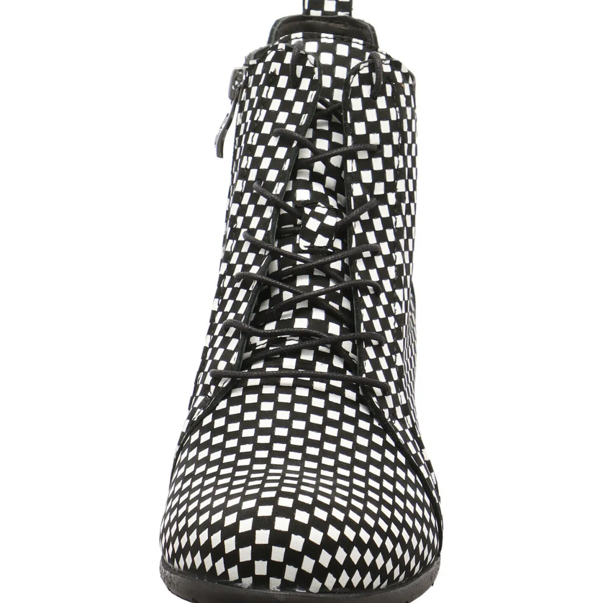 Das Obermaterial aus Echtleder presentiert sich im Karo Design in Schwarz, Weiß.
