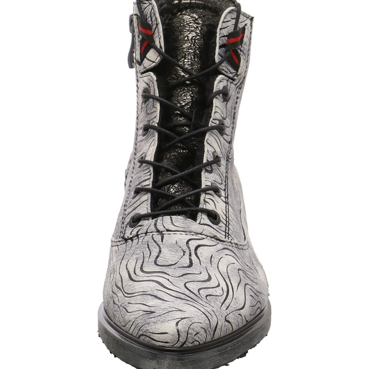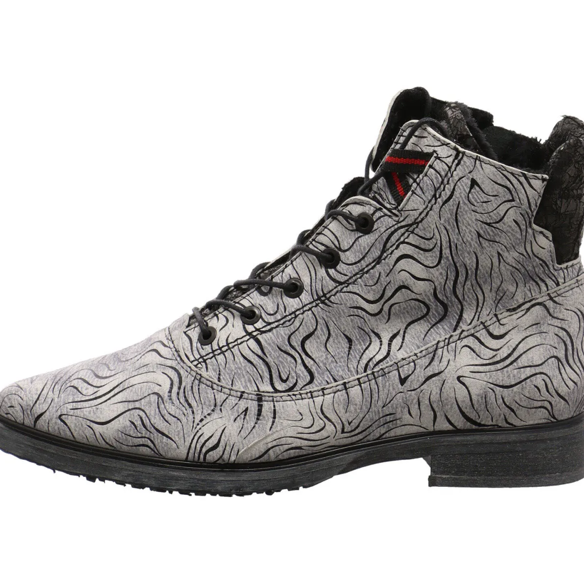 Das Obermaterial aus Echtleder fällt durch seinen Animal ähnlichen Print, im Zebra Look, Grau mit Schwarz, sofort ins Auge.