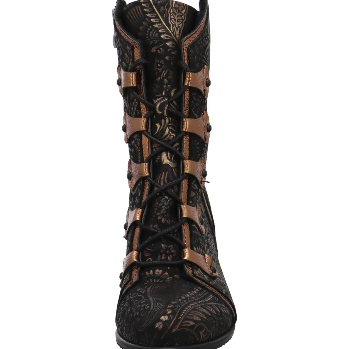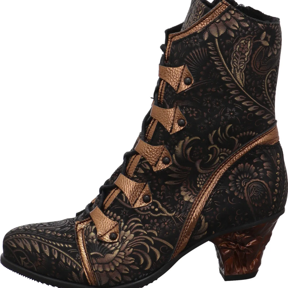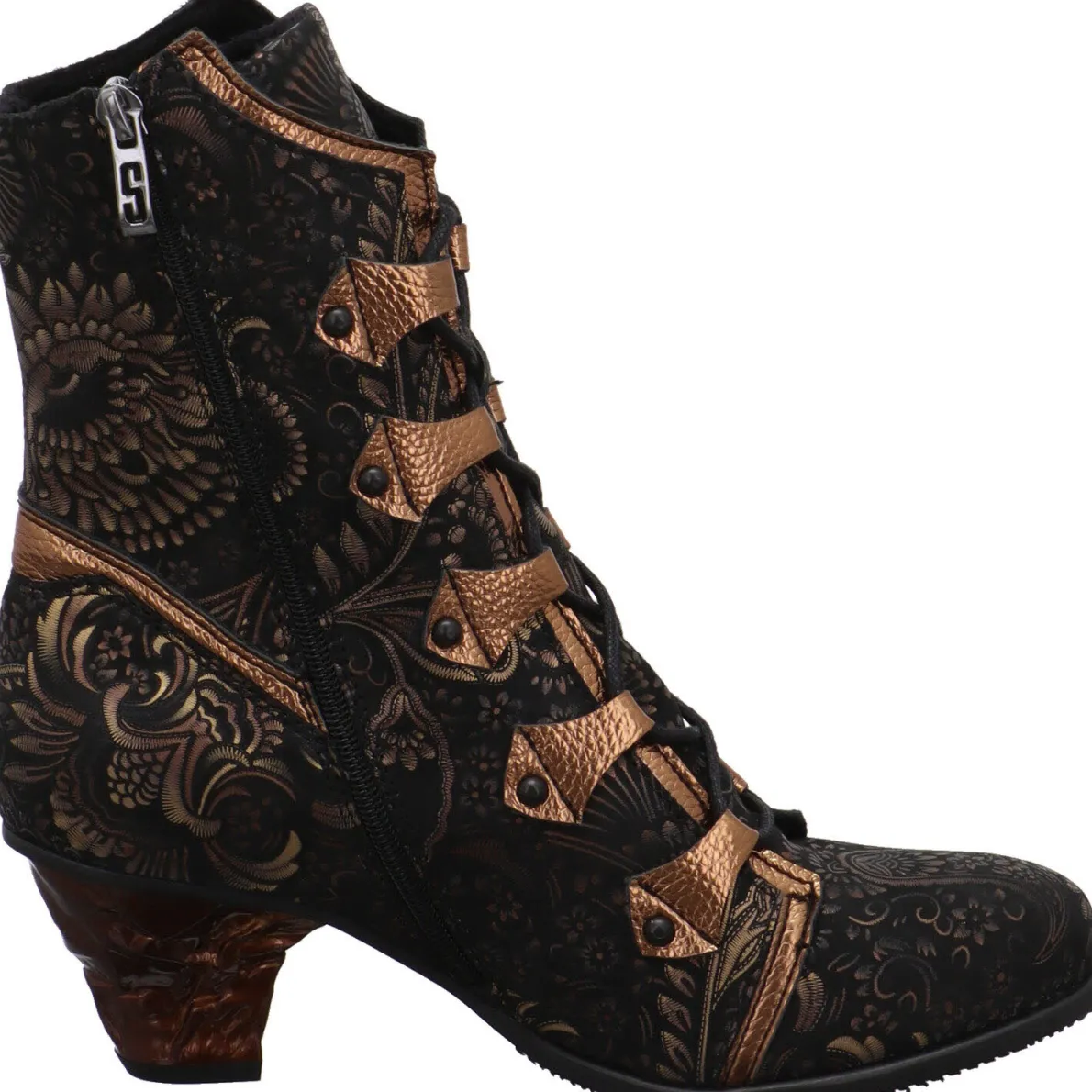 Durch den seitlichen Reißverschluss und die regulierbare Schnürung ist der Einstieg besonders einfach. Der individuell gestaltete Absatz zaubert lange Beine und das Innenfutter ist soft angeraut.