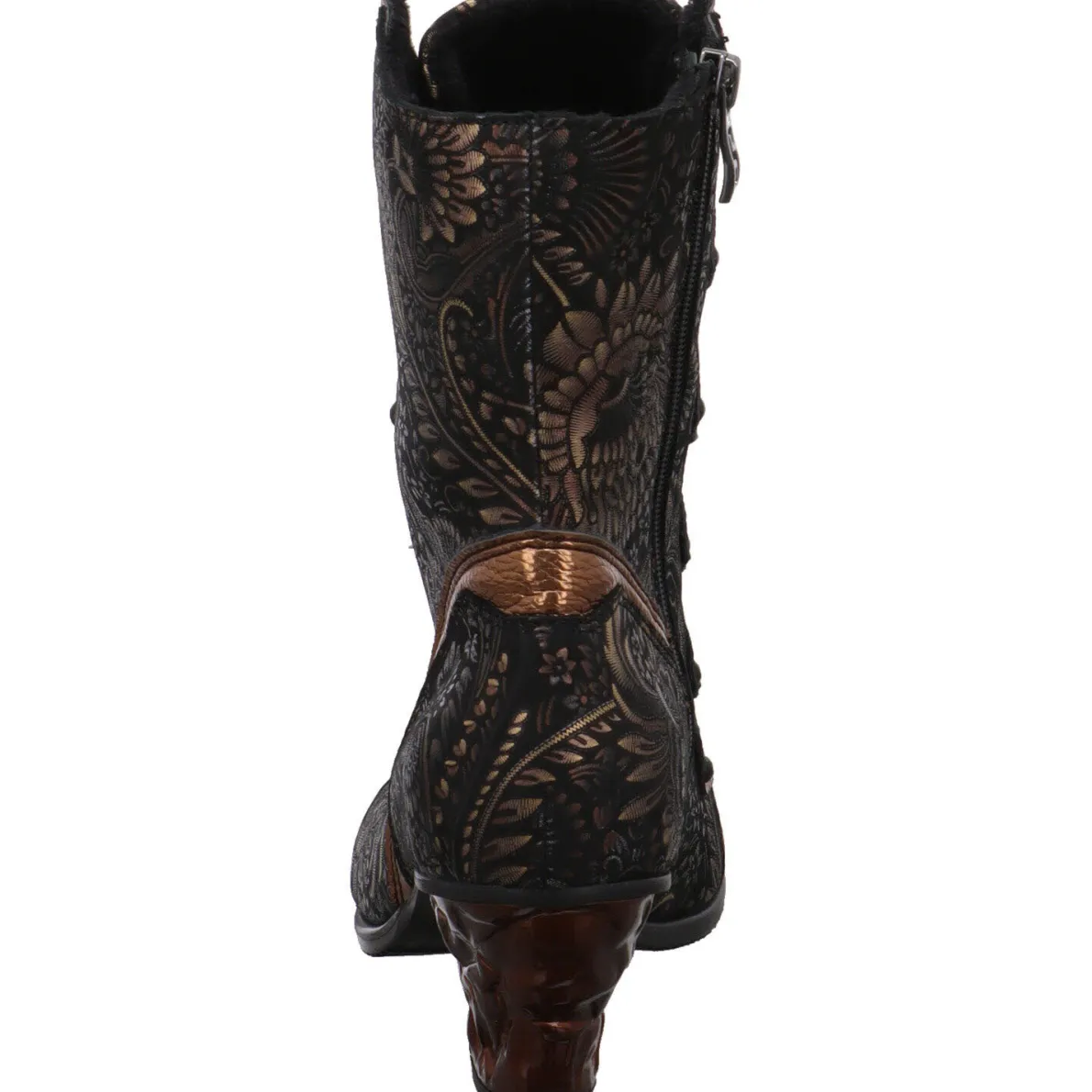 Sie wurde aus weichem Nubukleder in Schwarz gefertigt und mit einem eleganten floralen Muster verziert, das in warmen Bronzetönen schimmert.