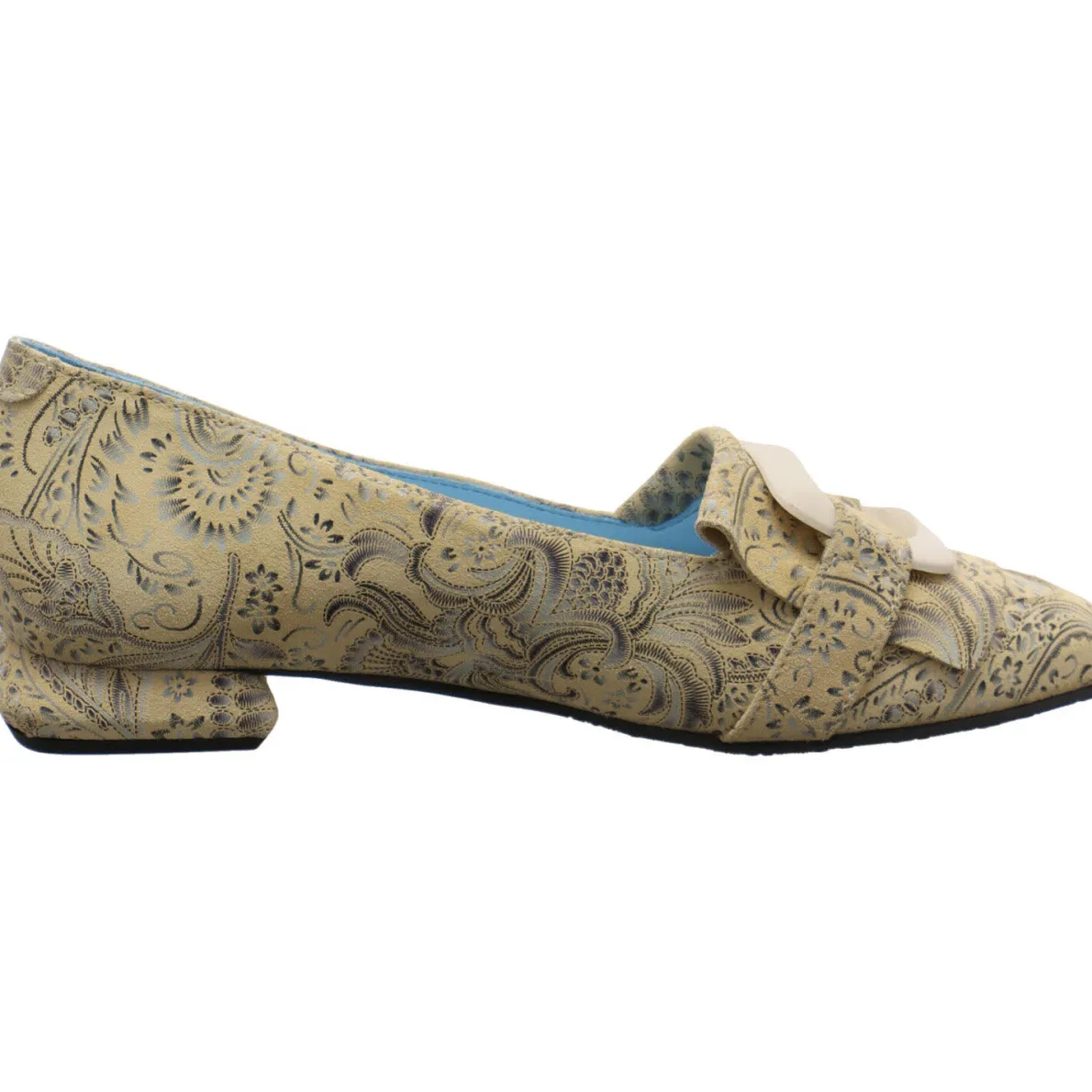 Ausgewähltes Veloursleder in Beige wurde durch ein zartes, individuelles Blumen Muster gekonnt in Szene gesetzt.