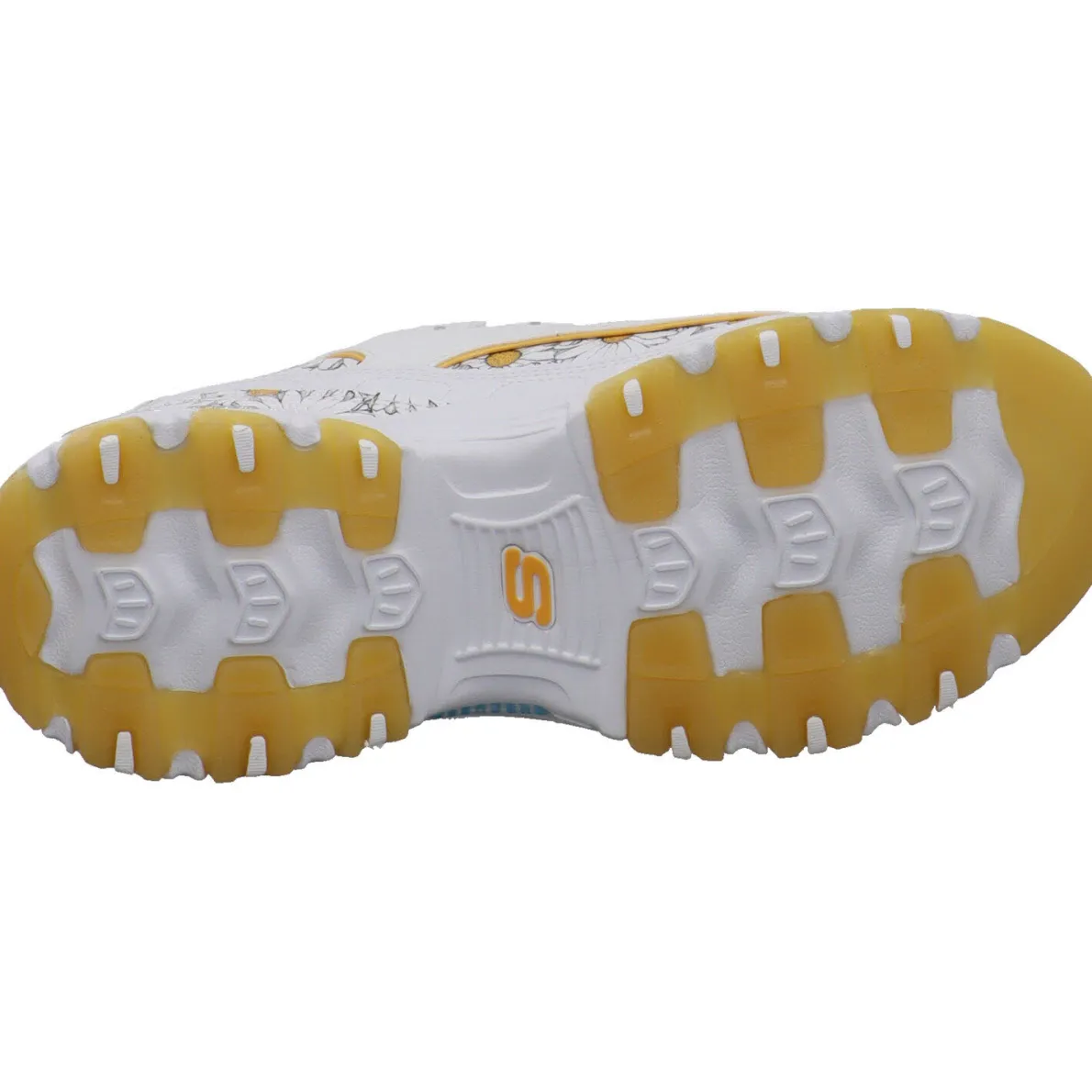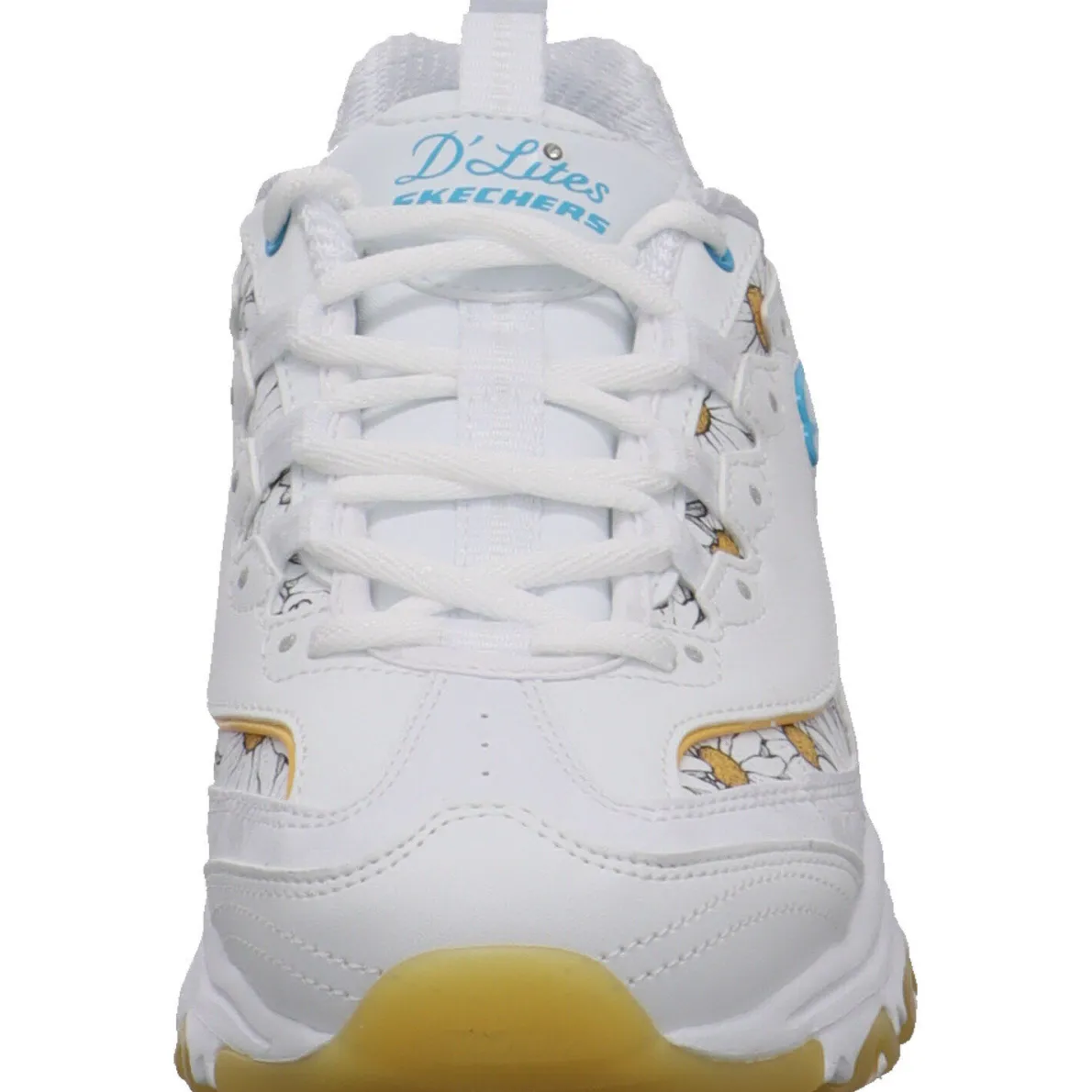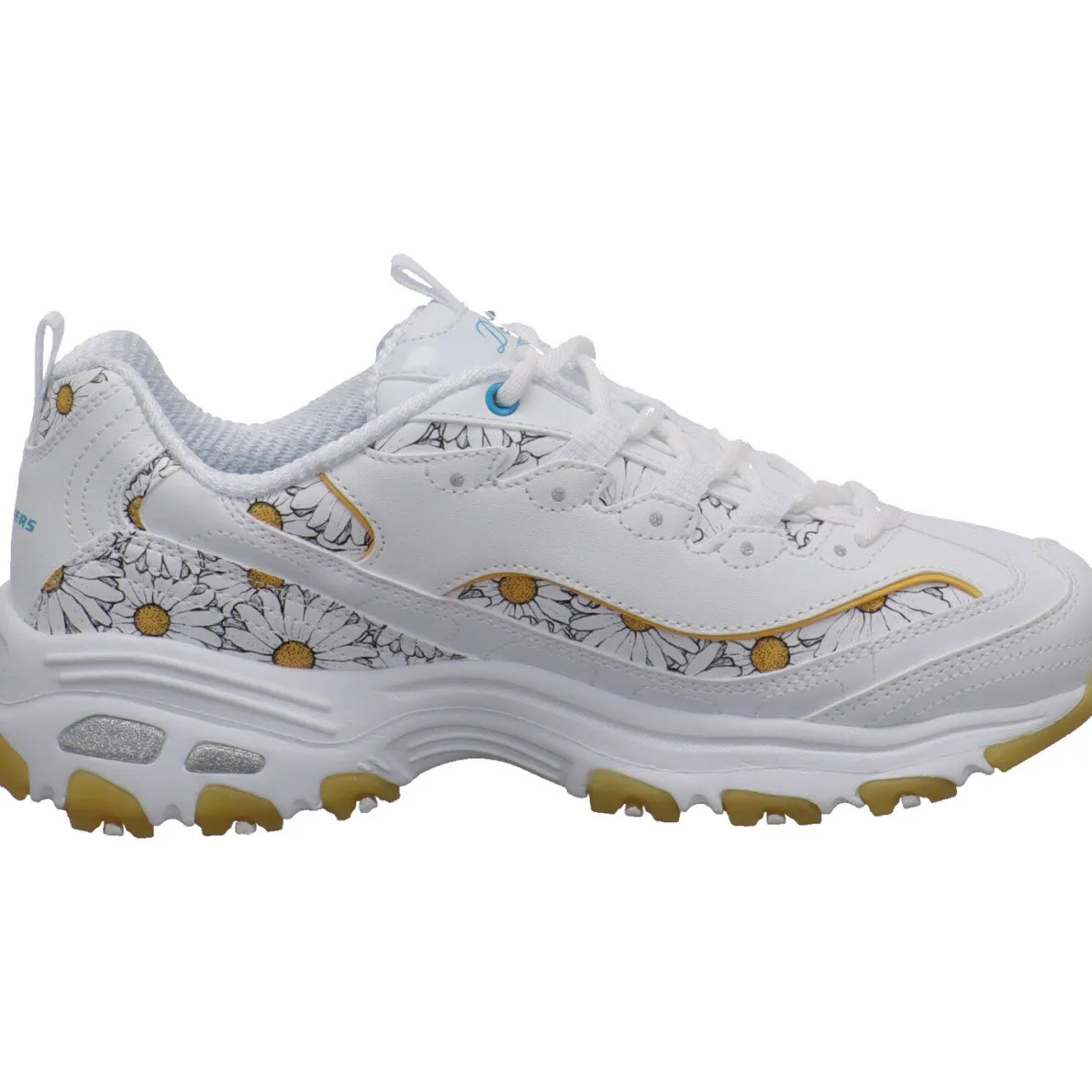 Ein toller Eyecatcher ist dieser Chunky Sneaker für Damen D’lites Daisy Dream von Skechers. Das Obermaterial wurde aus Kunstleder in Weiß gefertigt und mit einem tollen Einsatz mit einem Mageriten Blumen Print versehen. Einsätze an der Schnürung und Laufsohle, die Silber schimmern sind weitere Hingucker.