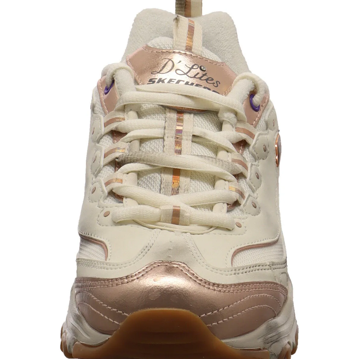 Das Obermaterial in Weiß wurde aus einem tollen Mix aus Echtleder und Synthetik gefertigt und mit Metallic schimmernden Einsätzen in Bronze verziert. Durch die beiden Textil Laschen am Schaft ist der Einstieg ganz leicht und mit der Schnürung kann er optimal an den Fuß angepasst werden. Das Frottee Innenfutter bietet dir ein tolles Tragegefühl und dank der gepolsterten Skechers Air-Cooled Memory Foam Innensohle ist der Schuh super weich und passt sich perfekt deinem Fuß an.