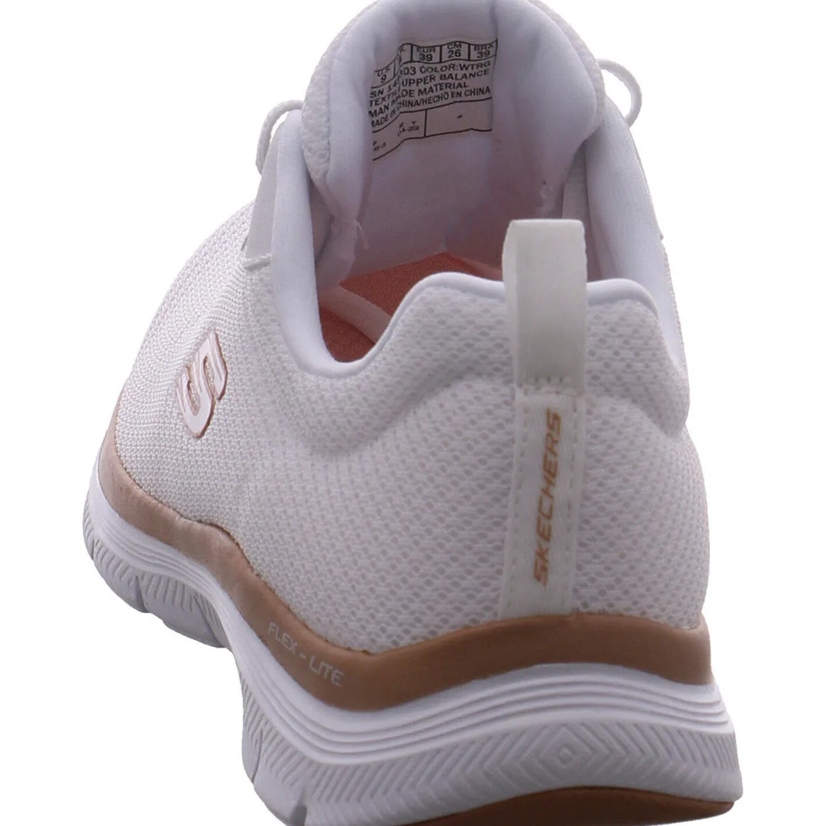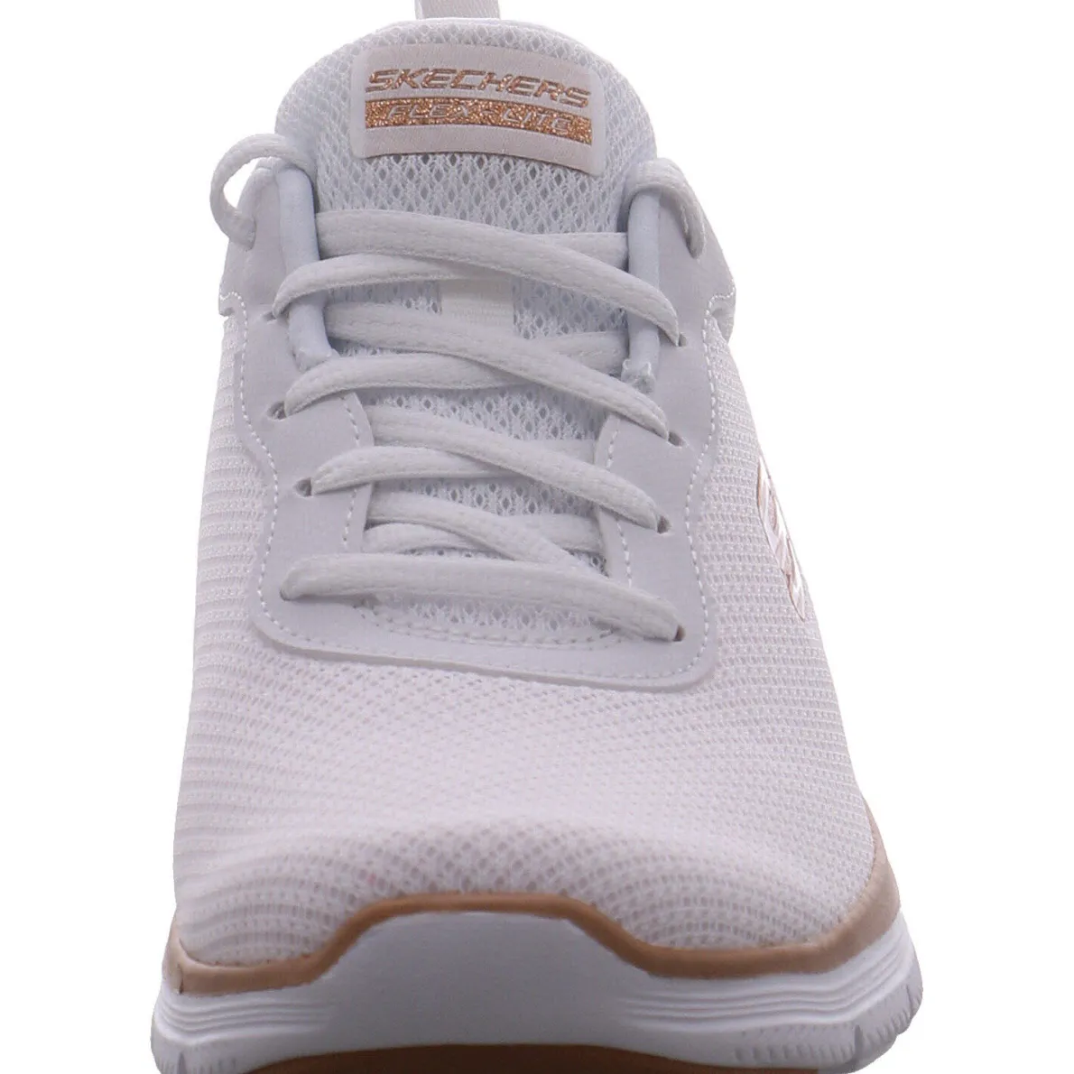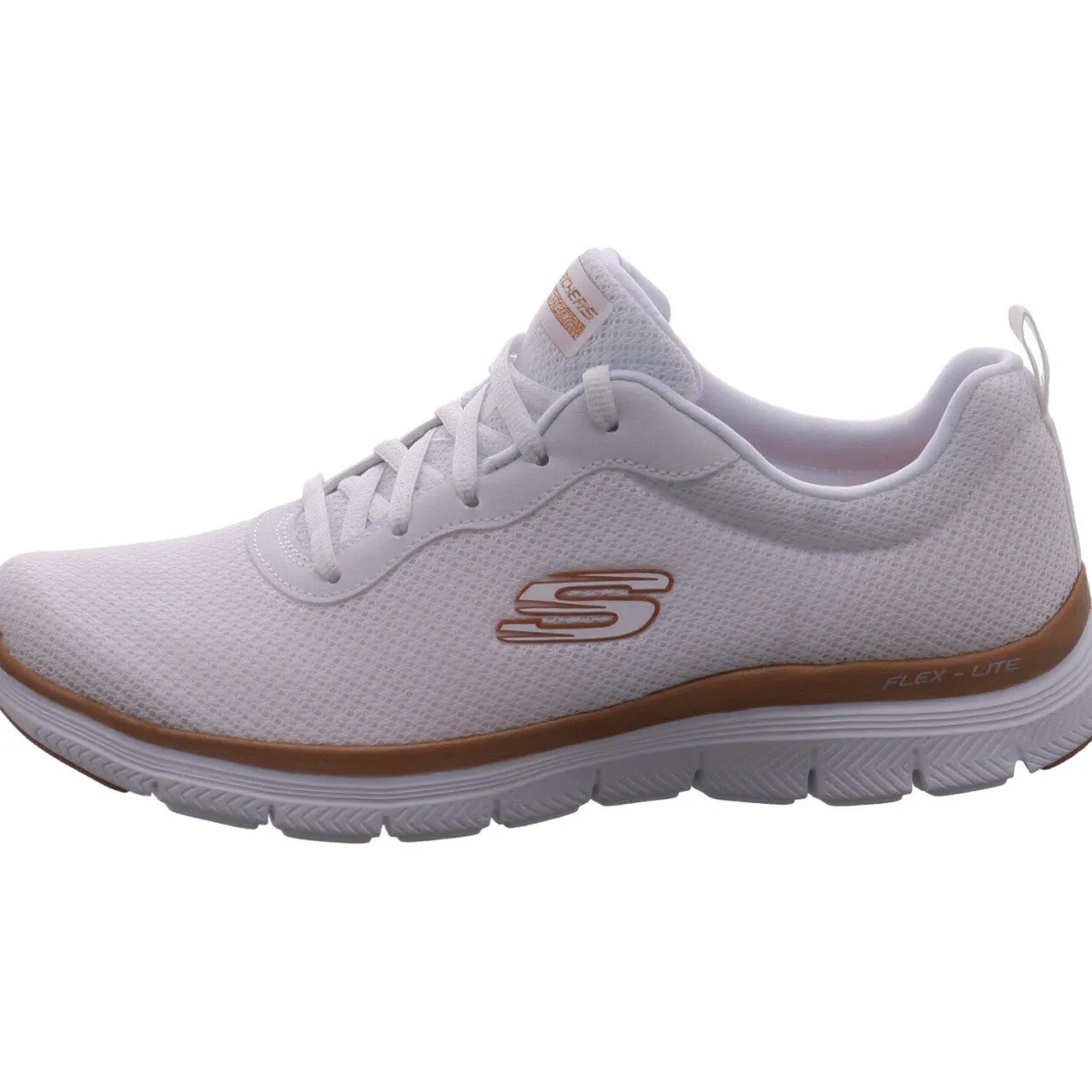 Der Flex Appeal 4.0 Brilliant View von Skechers in Weiß ist ein komfortabler Damen Sneaker aus Textil im sportlich bequemen Design. Die Laufsohle in Weiß und Akzente in Bronze fallen sofort ins Auge..