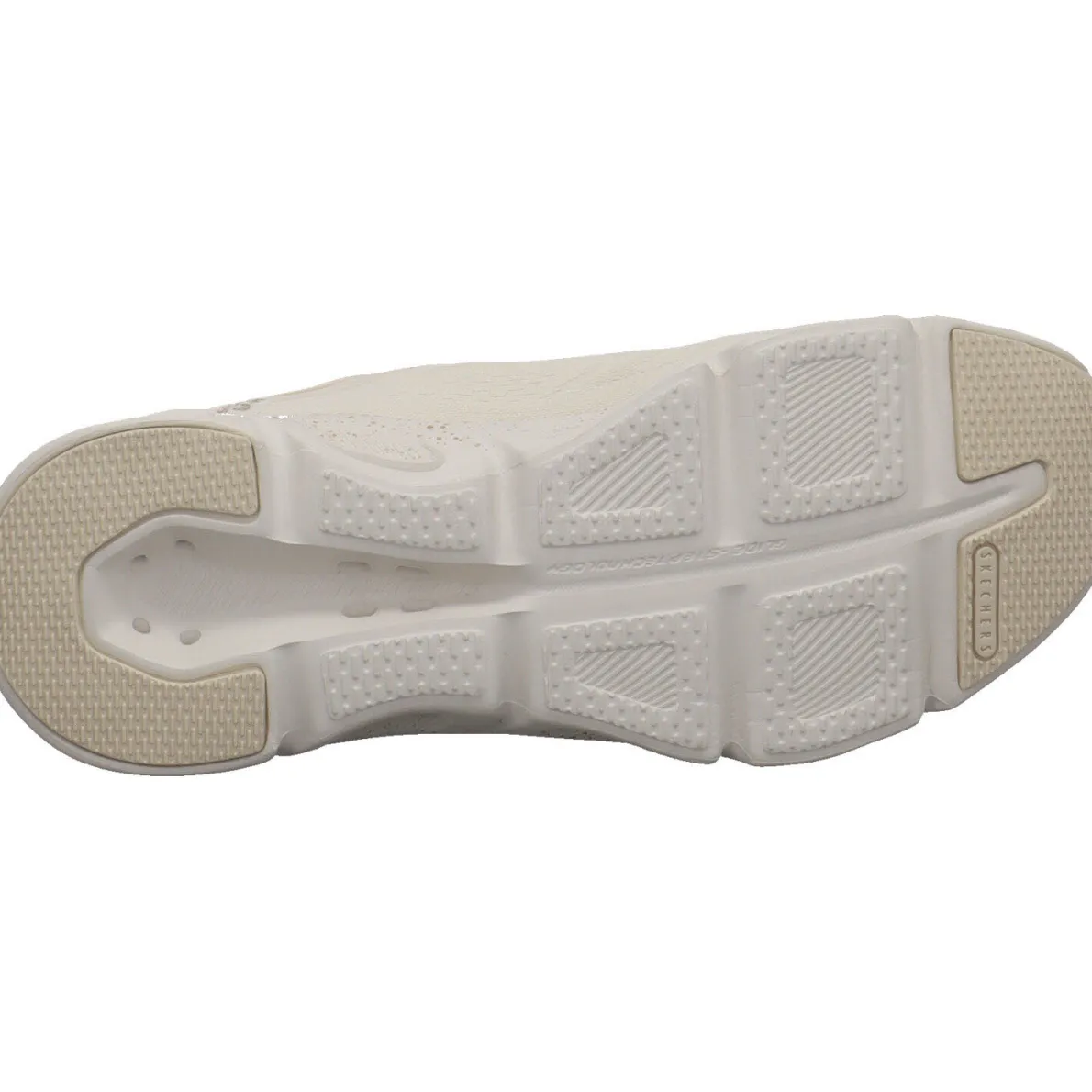Der Glide-Step Gratify Pace von Skechers ist ein modischer und überaus praktischer Damen Sneaker. Er wurde aus Textil Funktionsmesh in Creme Weiß gefertigt und ist mit Akzenten in Gold unterlegt. Der Sneaker gehört zur Hands Free Slip-ins Kollektion, denn auch hier wurde das Komfort Pillow an der Ferse eingearbeitet. Damit kannst du ohne Hilfsmittel in den Schuh hineinschlüpfen. Unterstützt wird das Ganze durch die Gummischnürung und der Lasche an der Zunge. Das Air Cooled Memory Foam Fußbett passt sich ganz individuell deinem Fuß an. Das besondere Design der Glide Step Zwischensohle bietet eine weiche, kissenartige Landung und unterstützt dich bei jeder Bewegung. Ein tollervoll veganer Allrounder für die Freizeit und super geeignet als Sportschuh für dein leichtes Training.