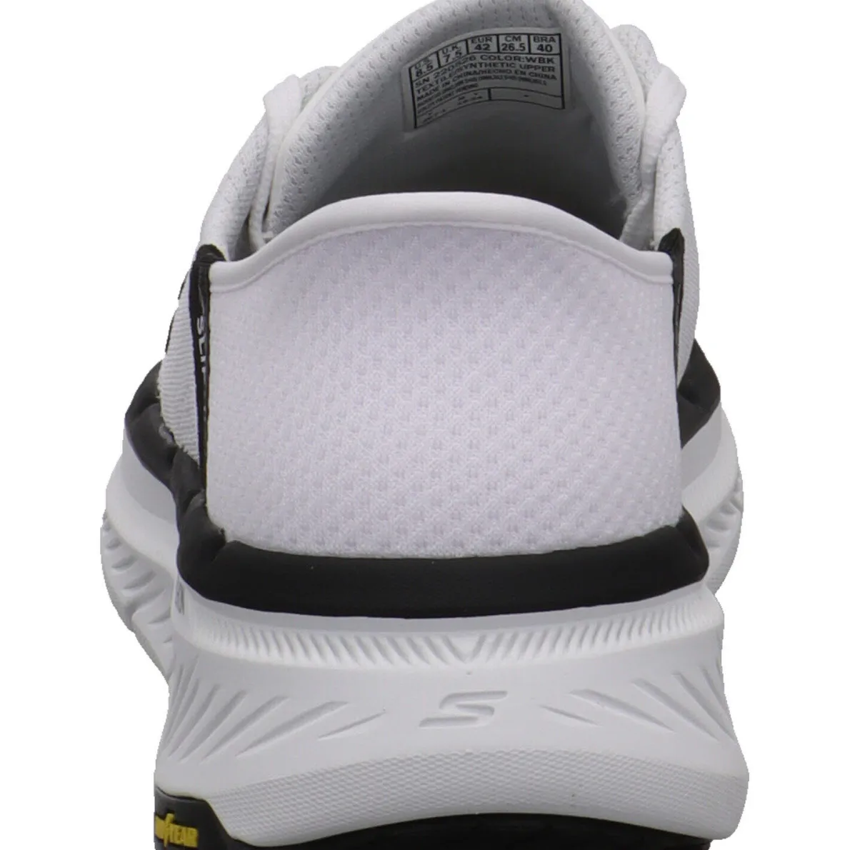 Der Schuh ist in einem vielseitigen Weiß und Schwarz gefertigt und besteht aus Textil. Er ist an der Schuhspitze und Ferse verstärkt, was ihn besonders robust macht.