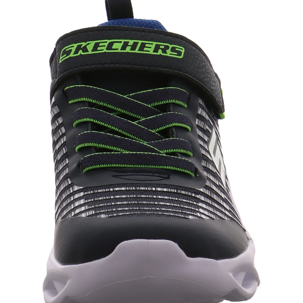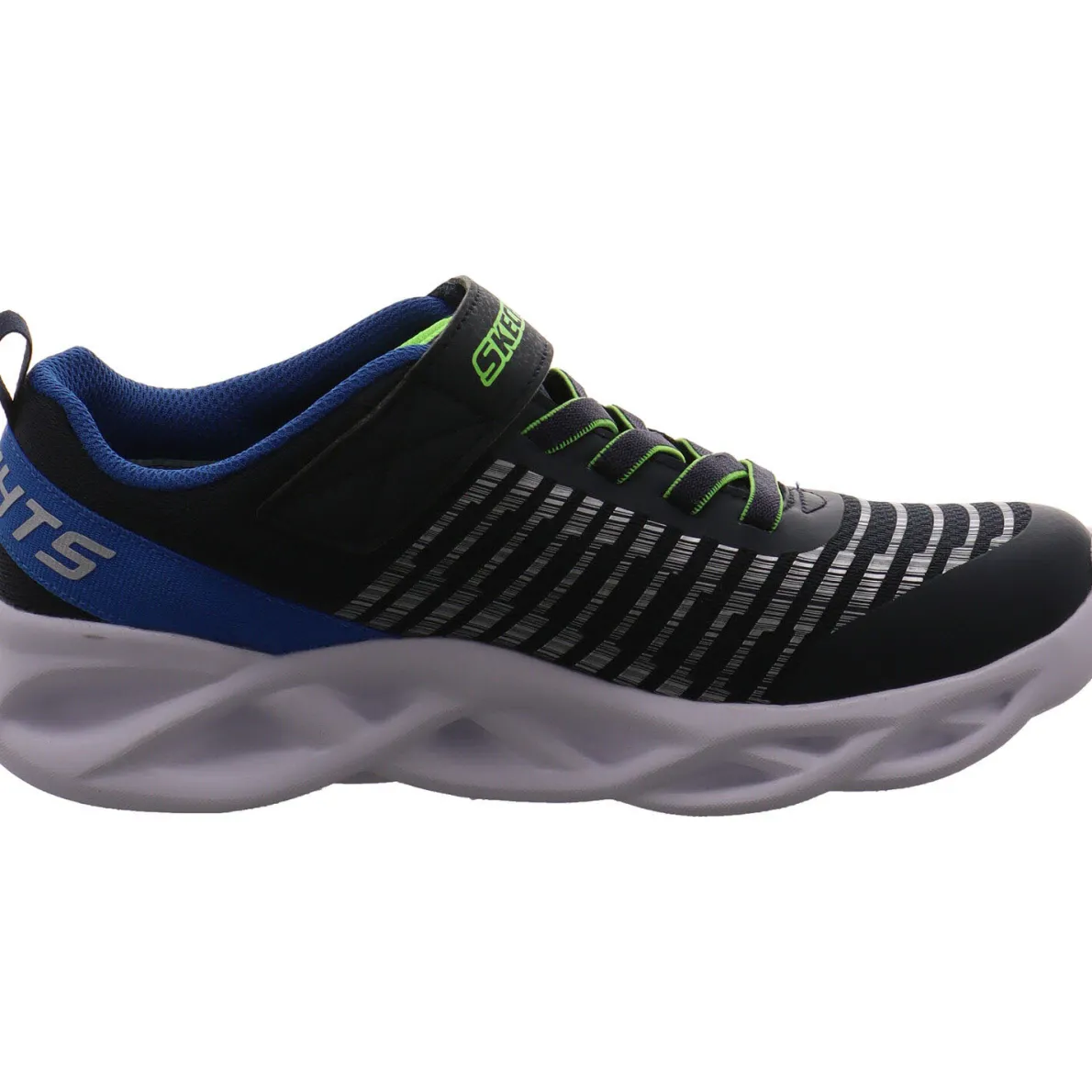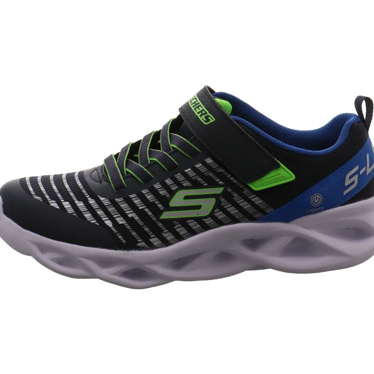 Der Skechers S Lights Twisty Brights ist ein cooler Kinder Sneaker in Schwarz mit Blau und Neongrün und wurde aus anpassungsfähigem Textil mit synthetischen stabilisierenden Einsätzen gefertigt. Schuhzunge und Schaftbereich sind angenehm gepolstert und tragen zu einem komfortablen Laufgefühl bei. Das Streifen Design in Silber an der Seite wertet den Schuh nochmal auf.