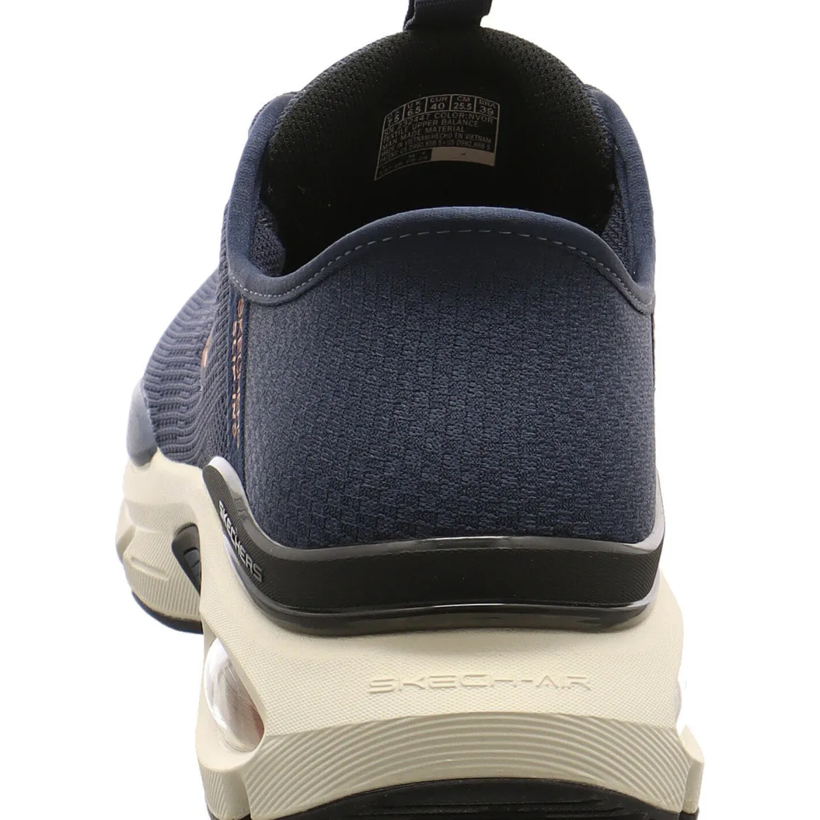 Das Obermaterial aus Textil Funktionsmesh, in Blau ist besonders flexibel. Synthetische Einsätze stabilisieren den Schuh. Die Air-Cooled Memory Foam Innensohle sorgt für maximalen Komfort. Dieses Modell ist zusätzlich mit der Luftgepolsterten Skech-Air-Zwischensohle ausgestattet. Diese sorgt für optimale Dämpfung bei jedem Schritt.