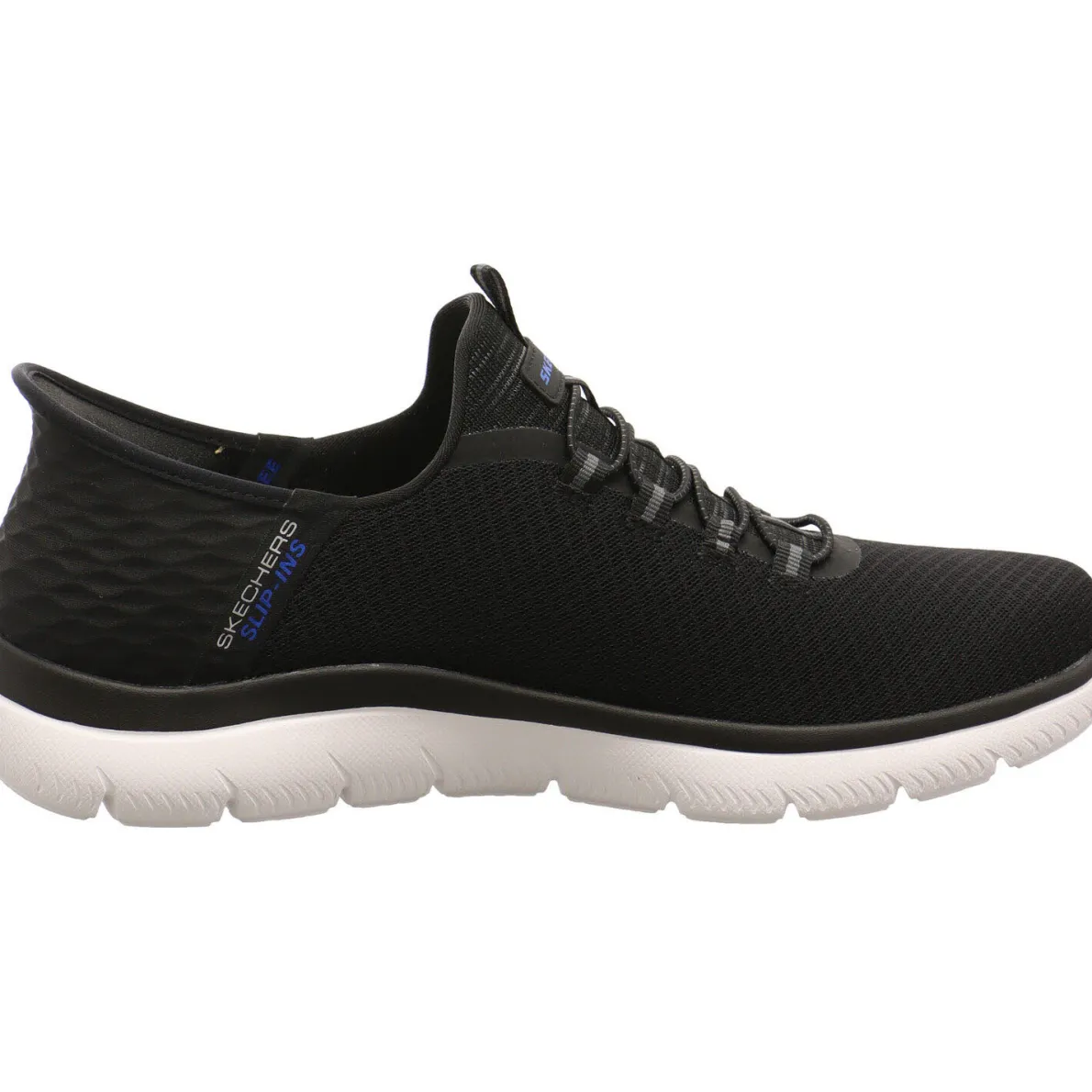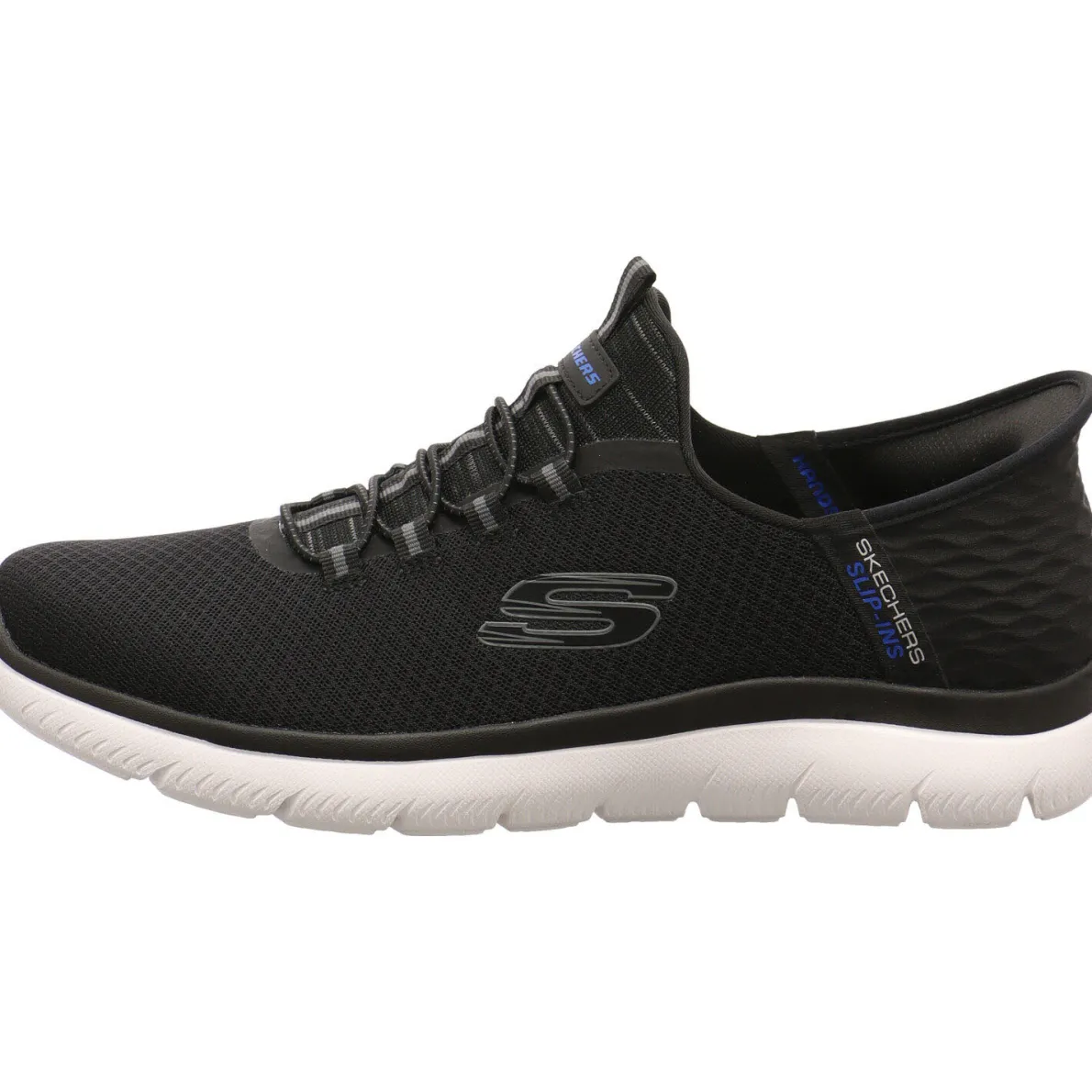 Der Summits High Range von Skechers in Schwarz ist ein komfortabler Herren Slip-Ins Sneaker in sportlich bequemem Design. Er ist sehr leicht und flexibel und ermöglicht durch die Bungeeschnürung ein einfaches Hineinschlüpfen. Eyecatcher sind das angesagte Design mit Highlights in Blau und das Obermaterial aus weich gewebten Textil mit einem individuellen Muster. Dabei sorgt das besondere Comfort Pillow in der Ferse dafür, dass der Schuh ohne jegliche Hilfe angezogen werden kann. Die Air Cooled Memory Foam Innensohle passt sich perfekt dem Fuß an und ist dabei luftig.