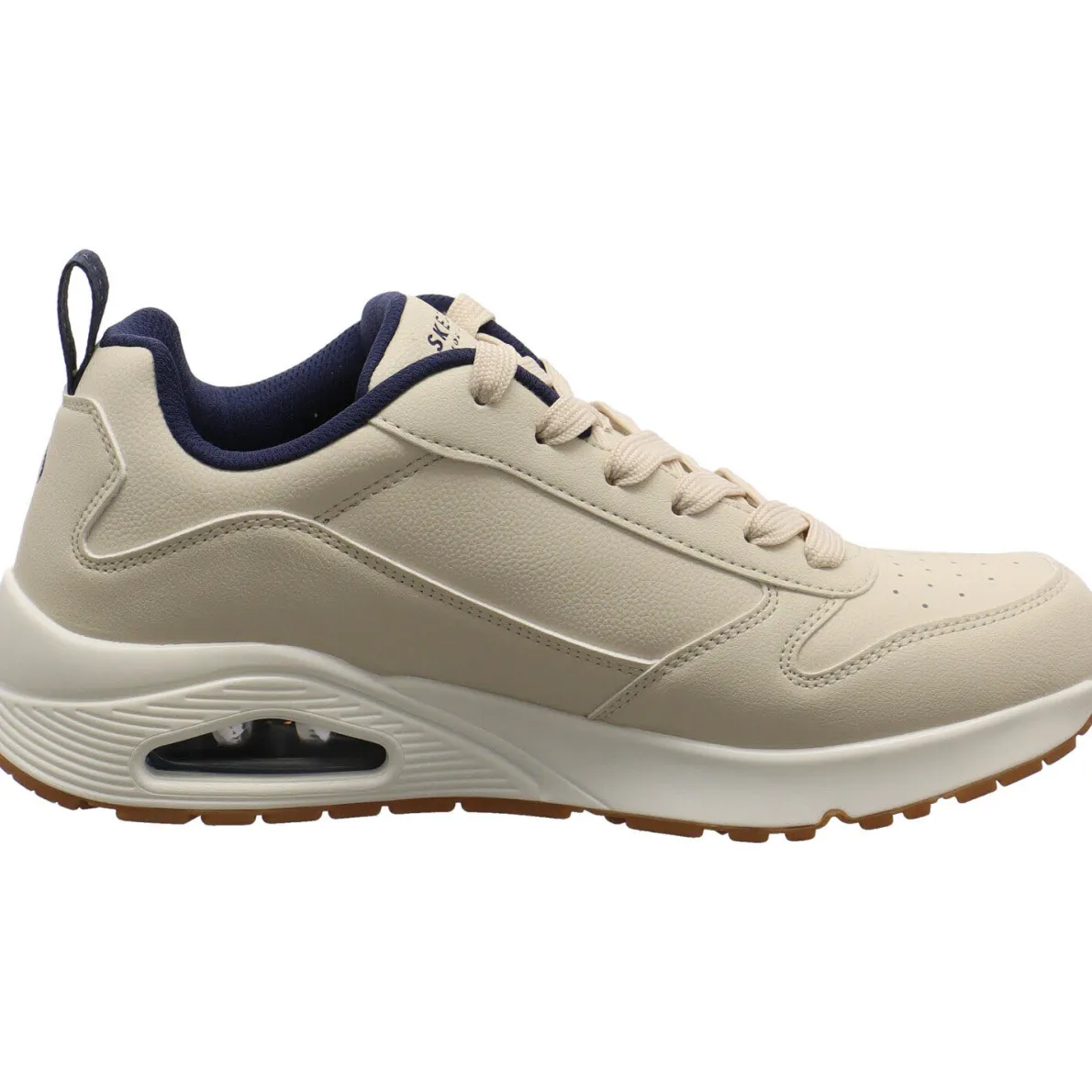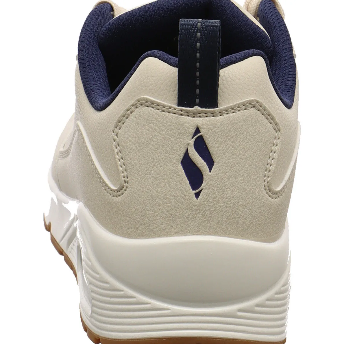 Modisch durch den Frühling und Sommer geht es mit dem Herren Sneaker Uno – Alder von Skechers. Das Obermaterial aus Kunstleder in Beige ist auf dem Blatt mit kleinen Lasercuts versehen. Der Einstieg ist durch die Lasche am Schaft ganz einfach und mit der Schnürung kannst du die Passform optimieren. Das Textil Innenfutter ist Blau abgesetzt und setzt einen tollen Farbkontrast. Die Skechers Air Cooled Memory Foam Innensohle und eine sichtbare luftgepolsterte Skech-Air Zwischensohle sorgen für optimalen Komfort.
