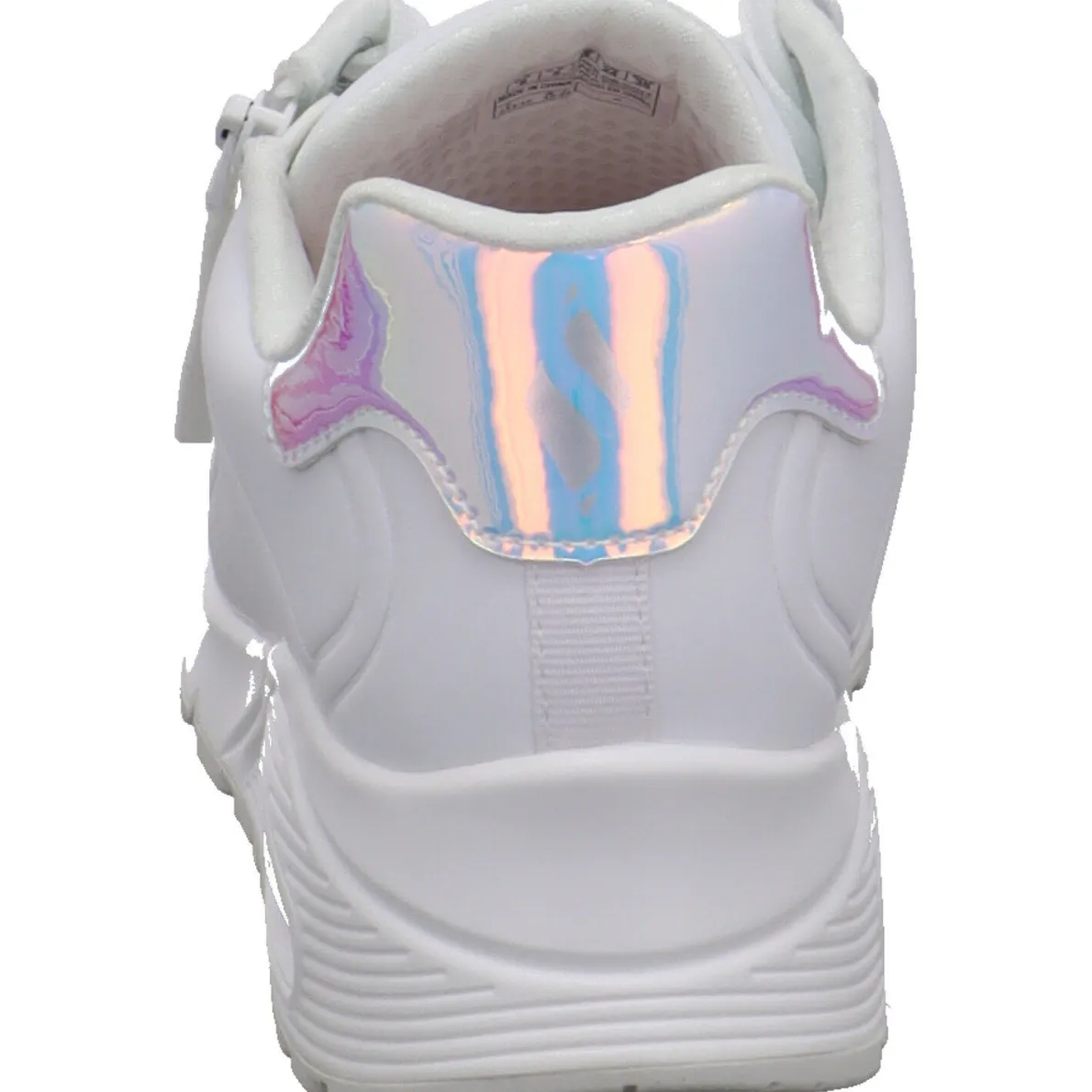 Das Modell Uno Gen1 Zip and Stride in Weiß, ist aus Kunstleder gefertigt und mit einem Schimmer Einsatz an der Ferse verziert. Kleine Lasercuts runden das modische Design dieses Kinder Schuh ab.