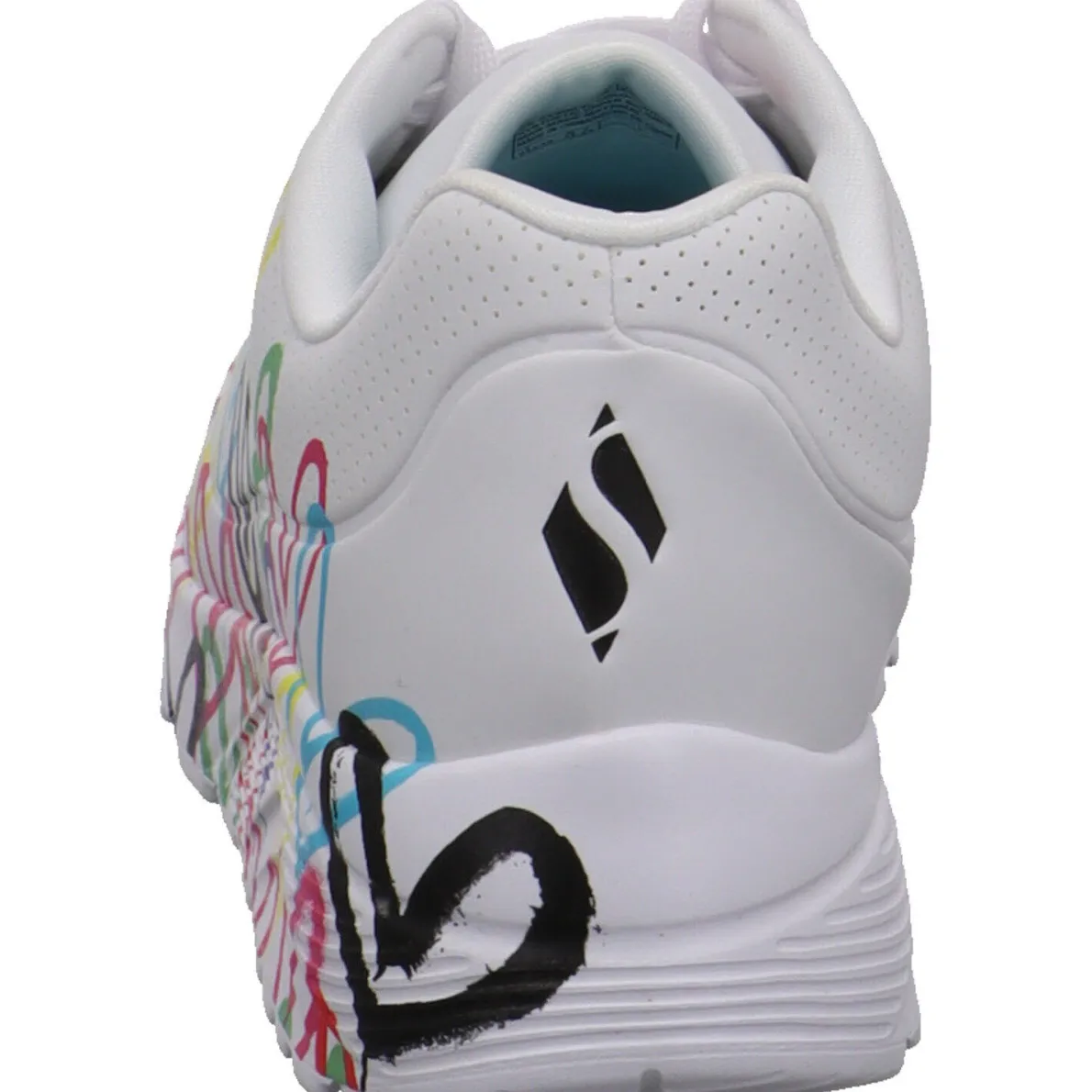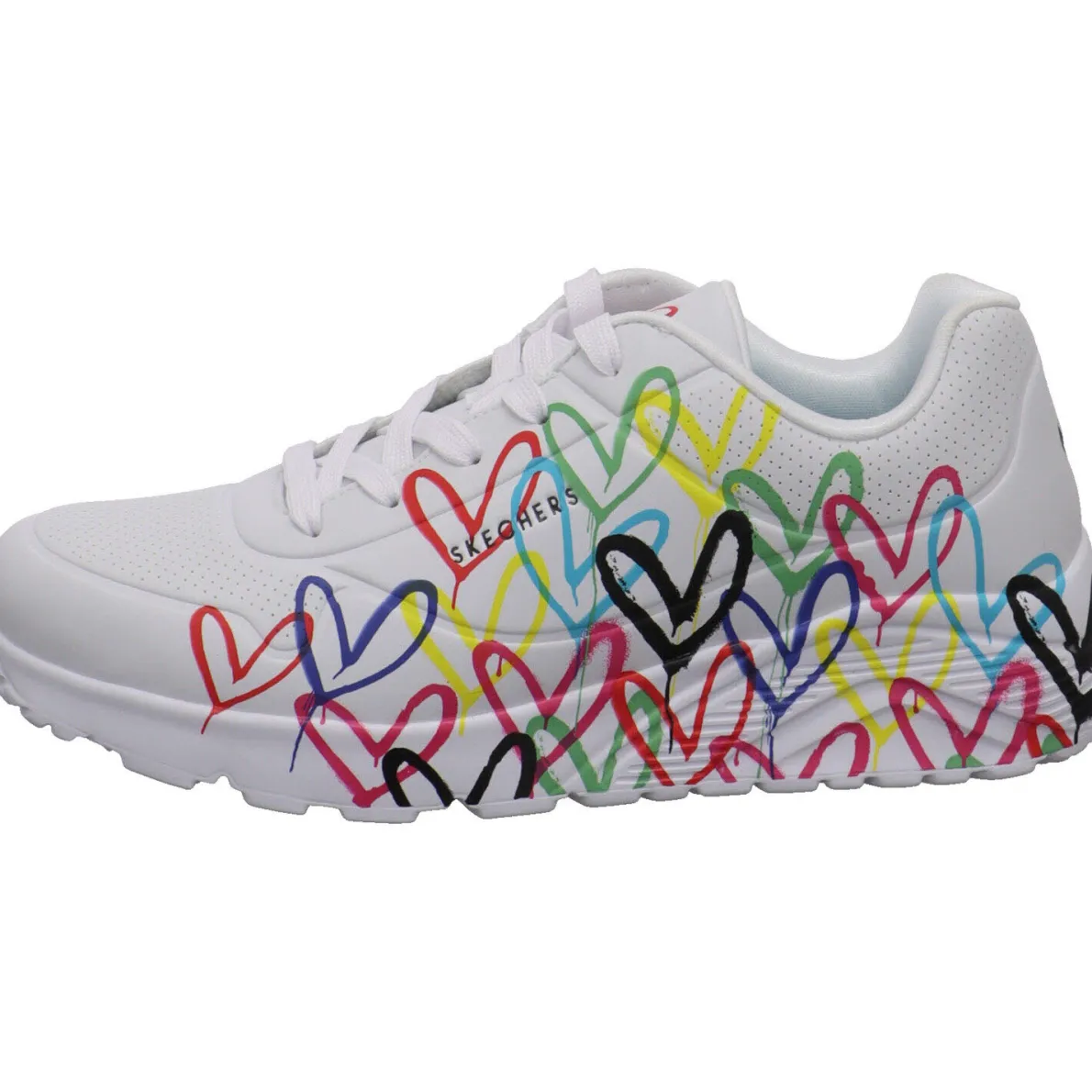 Das Obermaterial aus Kunstleder in Weiß ist mit einem tollen Herz Print in in Bunten Farben versehen. Das auffällige Design des Sneaker ist aus der Zusammenarbeit des international bekannten Wandmalers James Goldcrown und Skechers entstanden.