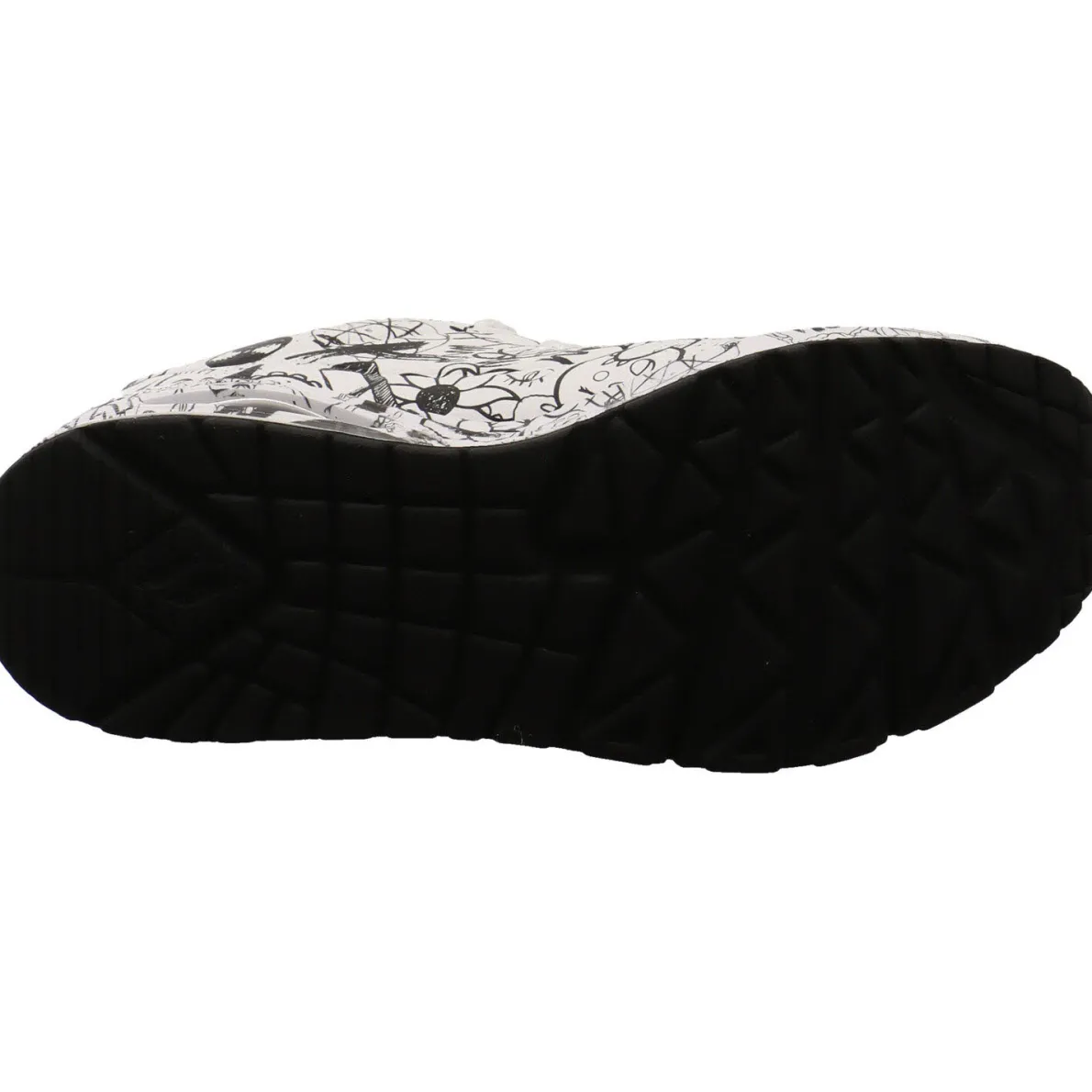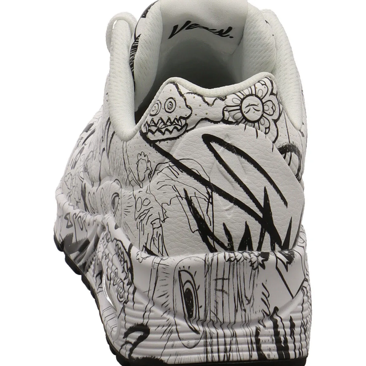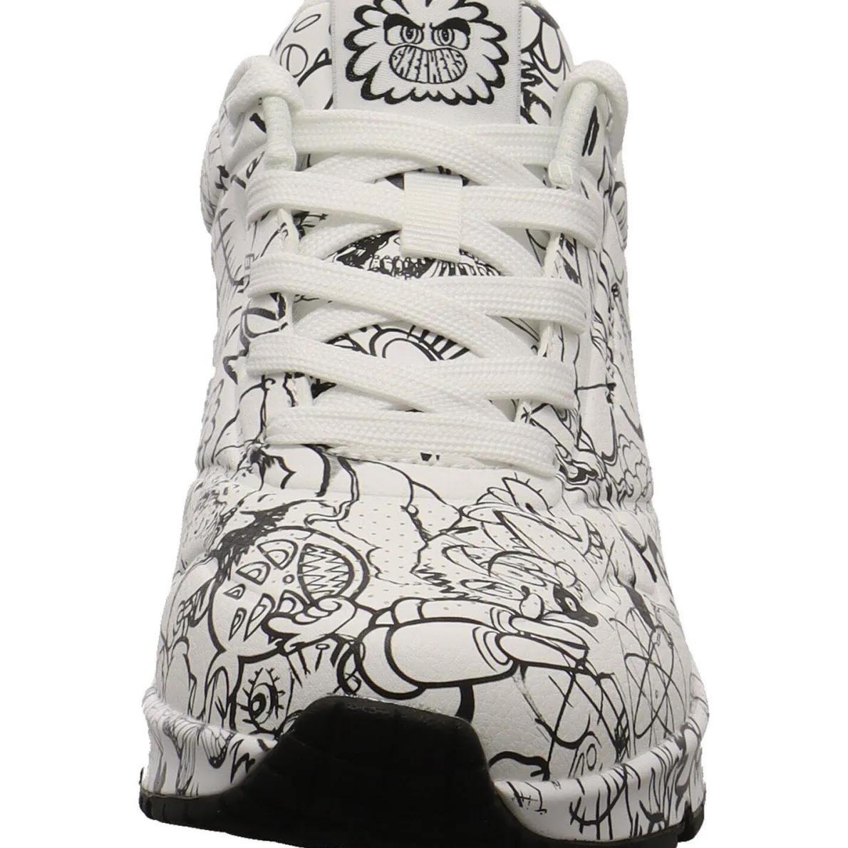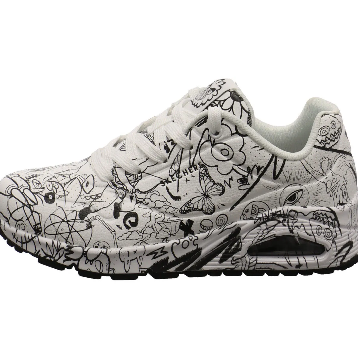 Ein ganz besonderer Damen Sneaker, ist das Modell Uno Process Sketch aus der Zusammenarbeit von Skechers und dem Künstler Vexx. Der Schuh ist mit den groben Skizzen des Künstlers versehen. Der Sneaker verfügt über ein Obermaterial aus synthetischem Durabuck in Weiß, mit den charakteristischen „Doodles” von Vexx, eine Skechers Air-Cooled Memory Foam Einlegesohle und eine sichtbare luftgepolsterte Skech-Air Zwischensohle. Der Schaft ist angenehm gepolstert und durch die Schnürung kann der Schuh perfekt an den Fuß angepasst werden.