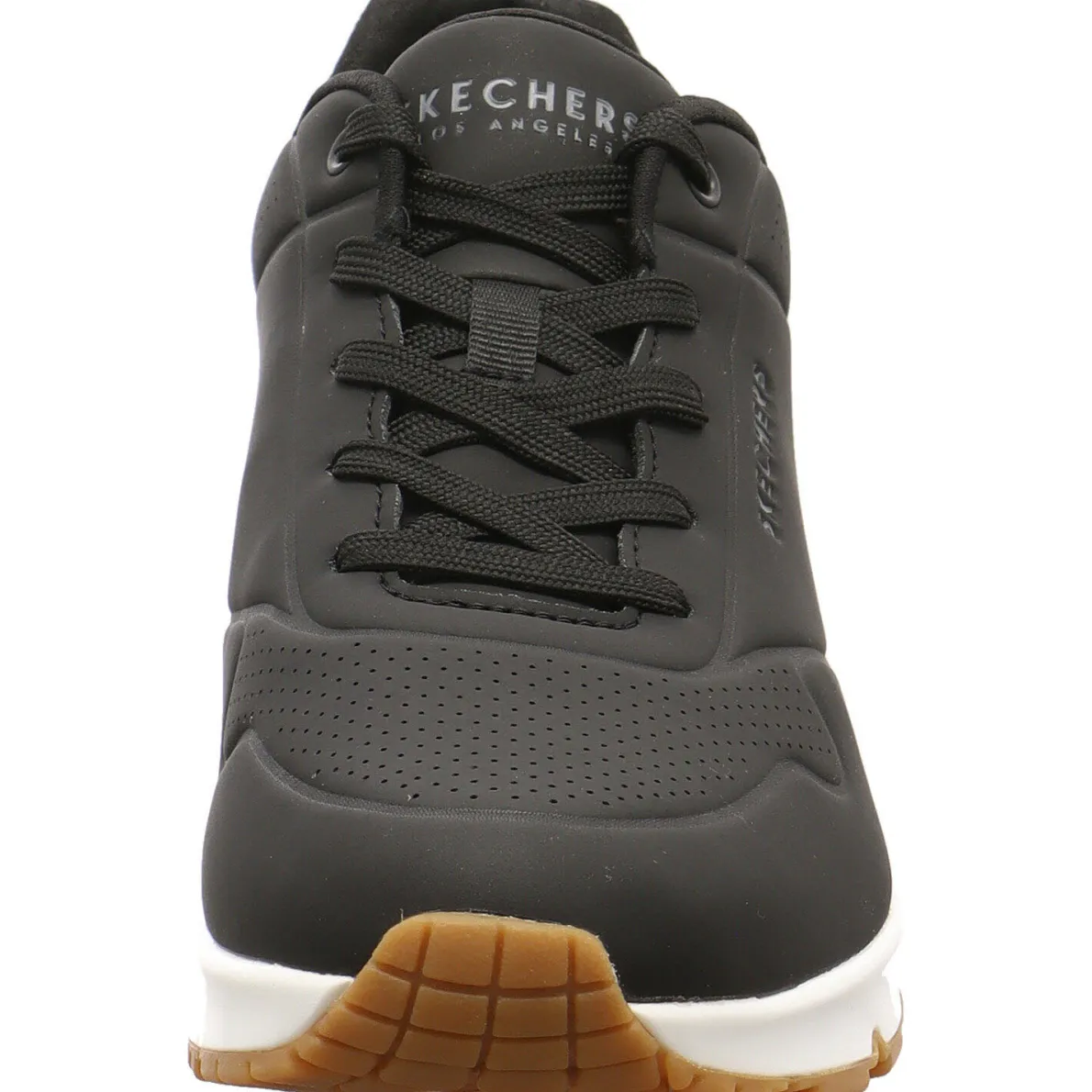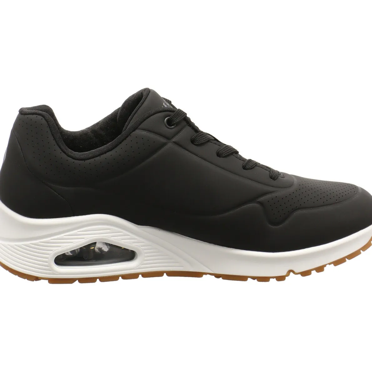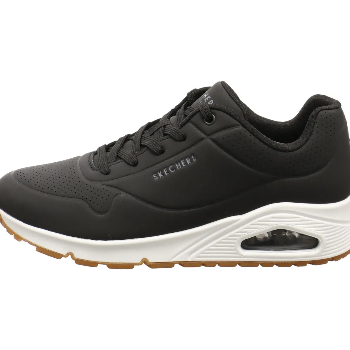 Voll im Trend liegst du mit dem Damen Sneaker Uno Stand on Air von Skechers. Das Obermaterial aus Kunstleder in Schwarz wird durch die Zwischensohle in Weiß toll in Szene gesetzt. Natürlich ist hier auch wieder das Lustkissen eingearbeitet und bietet dir einen tollen Tragekomfort.