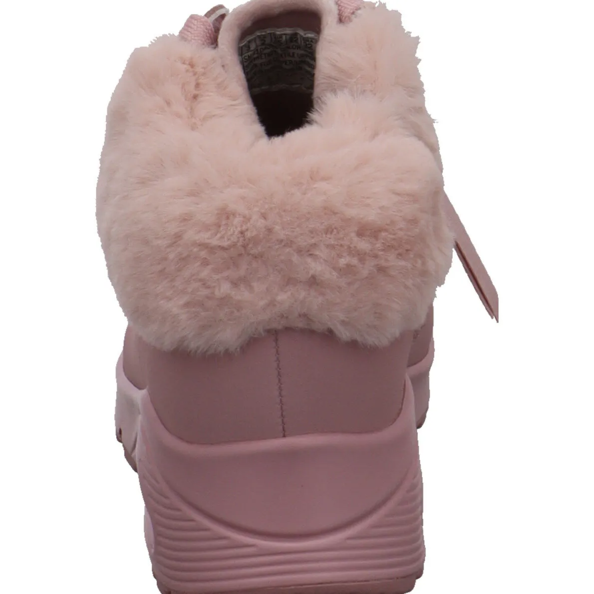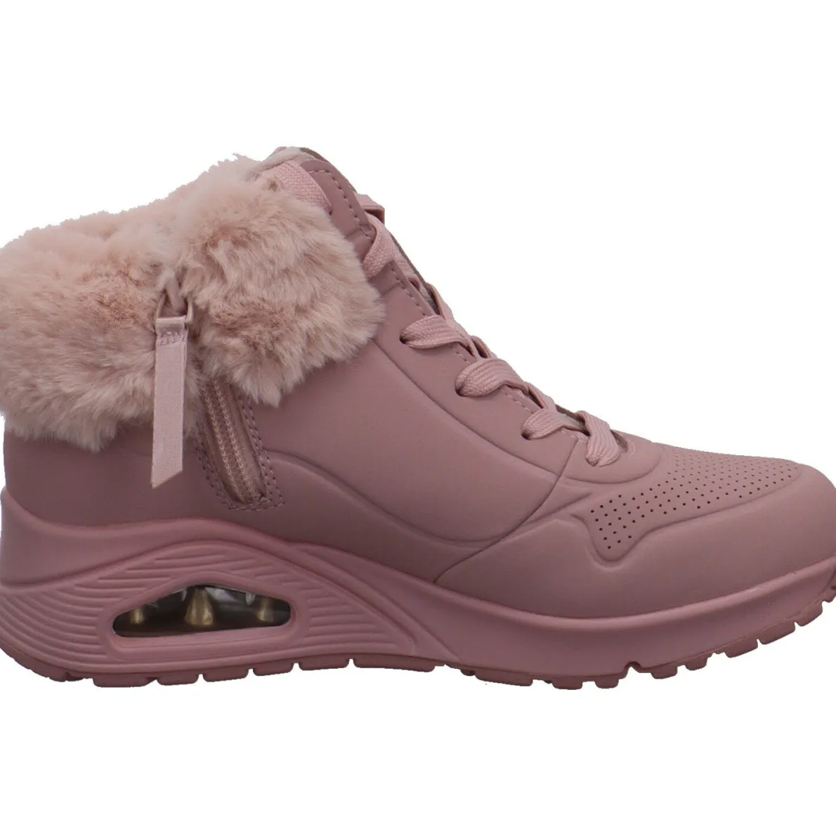 Er wurde aus Kunstleder in Rosa gefertigt und ist am Schaft mit einem weichen Plüschrand gearbeitet. Durch den seitlichen Reißverschluss ist der Einstieg Kinder leicht und mit der Schnürung kann er genau an den Fuß angepasst werden. Auch hier wurde die bekannte Skechers Air Cooled Memory Foam Innensohle verarbeitet. Zusammen mit der luftgepolsterten Zwischensohle, sorgt sie für einen tollen Tragekomfort.