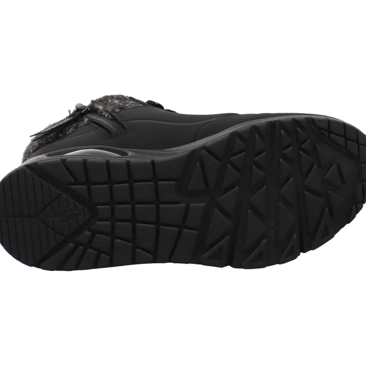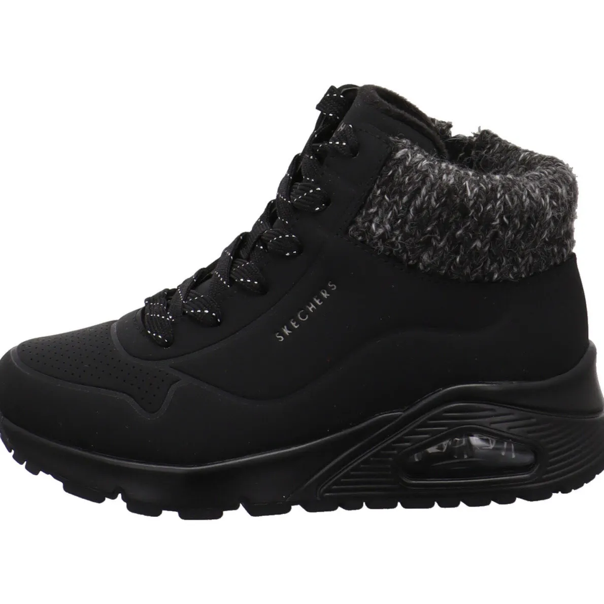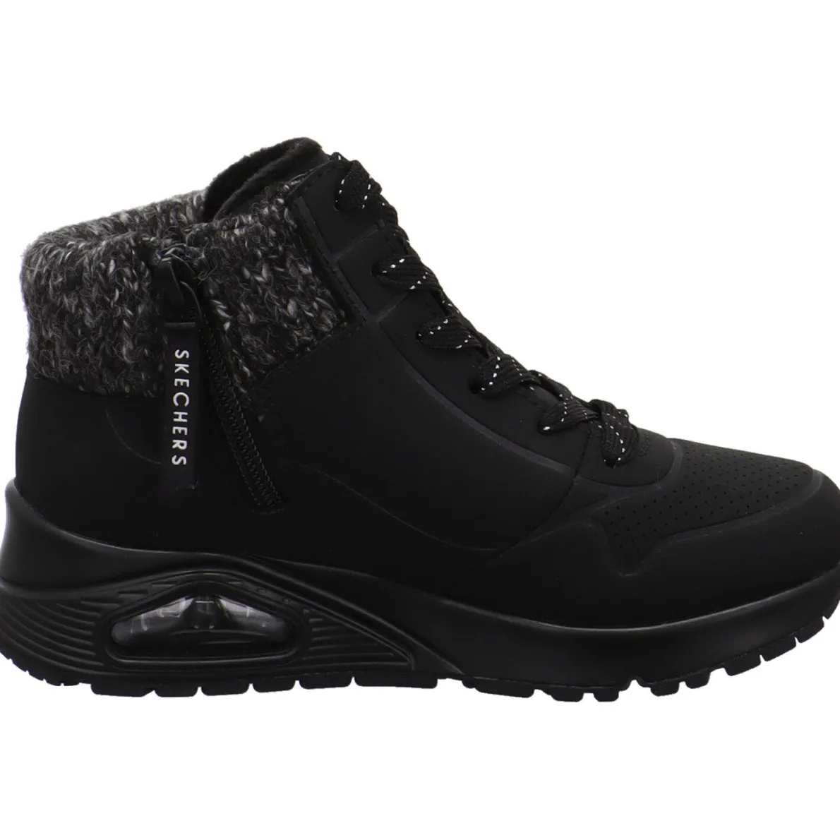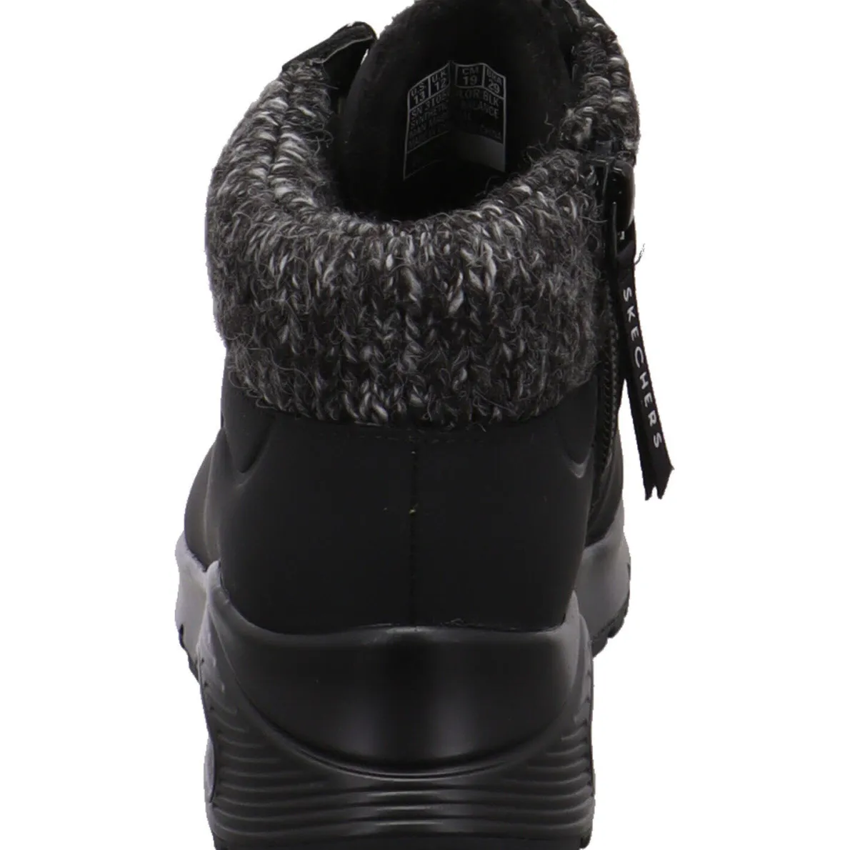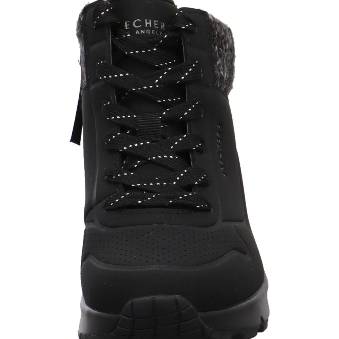 Er wurde aus Kunstleder in Schwarz gefertigt und ist am Schaft mit einem weichen Strickbund mit Glitzer Faden und kleinen Lasercuts auf dem Obermaterial gearbeitet. Durch den seitlichen Reißverschluss ist der Einstieg Kinder leicht und mit der Schnürung, welche auch den Glitzer Faden hat, kann er genau an den Fuß angepasst werden. Auch hier wurde die bekannte Skechers Air Cooled Memory Foam Innensohle verarbeitet. Zusammen mit der luftgepolsterten Zwischensohle, sorgt sie für einen tollen Tragekomfort.