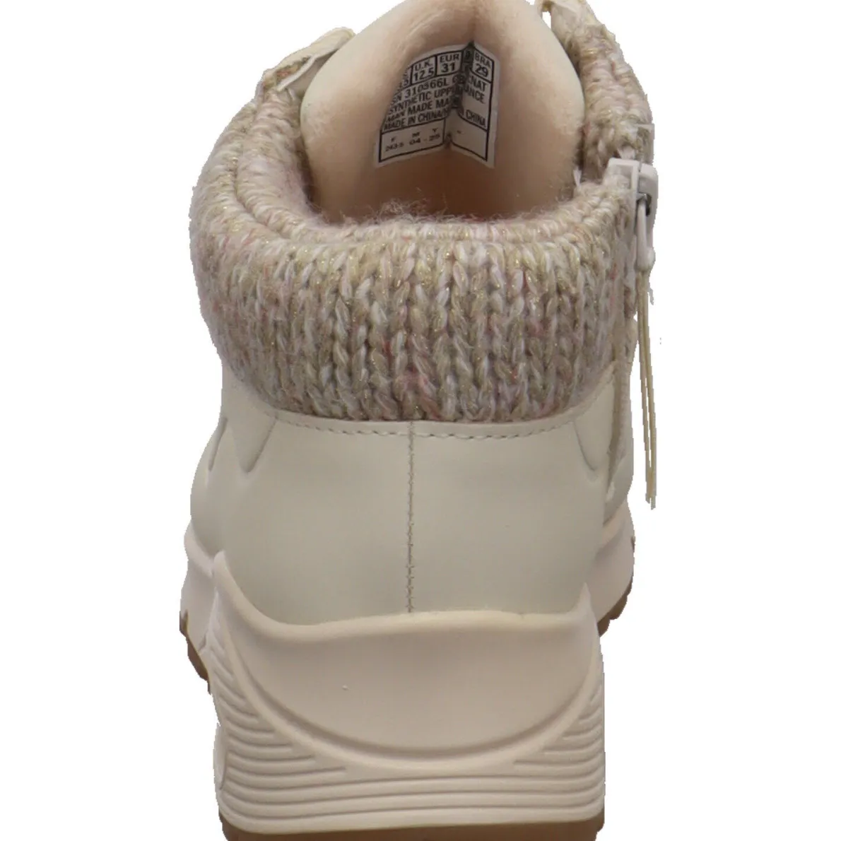 Er wurde aus Kunstleder in Beige gefertigt und ist am Schaft mit einem weichen Strickbund mit Glitzer Faden und kleinen Lasercuts auf dem Obermaterial gearbeitet. Durch den seitlichen Reißverschluss ist der Einstieg Kinder leicht und mit der Schnürung, welche auch den Glitzer Faden hat, kann er genau an den Fuß angepasst werden. Auch hier wurde die bekannte Skechers Air Cooled Memory Foam Innensohle verarbeitet. Zusammen mit der luftgepolsterten Zwischensohle, sorgt sie für einen tollen Tragekomfort.
