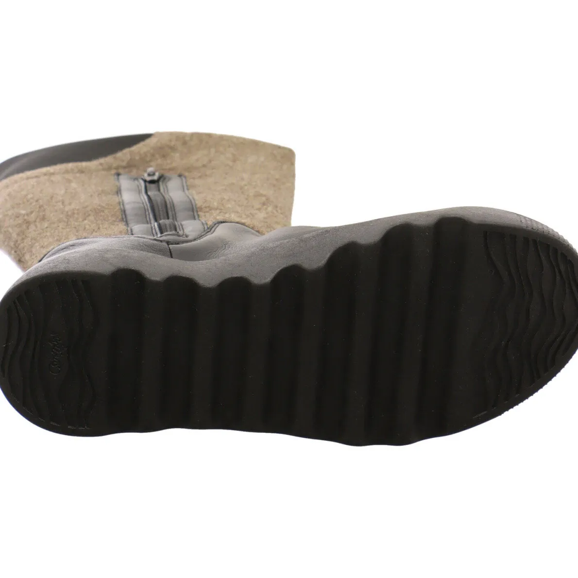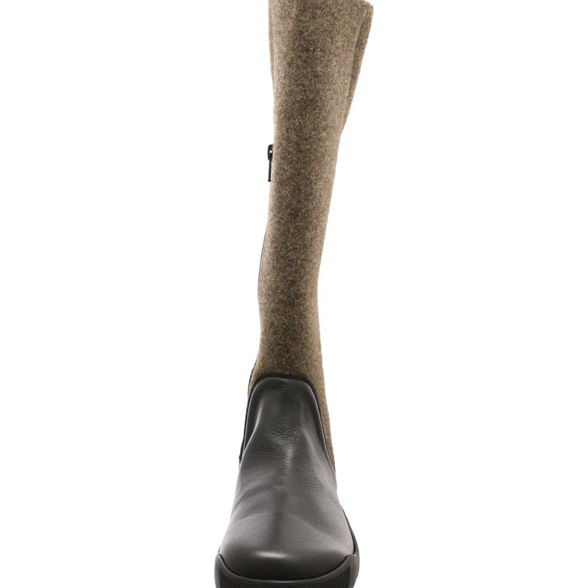 Gefertigt aus soft weichem Echtleder in Schwarz, ist der Schuh mit einem seitlichen Reißverschluss ausgestattet und einem Schaft aus trendigem Filz in Braun. Der Einstieg ist hinten mit einem flexiblen Textilpart versehen, welches für einen komfortablen Einstieg sorgt.
