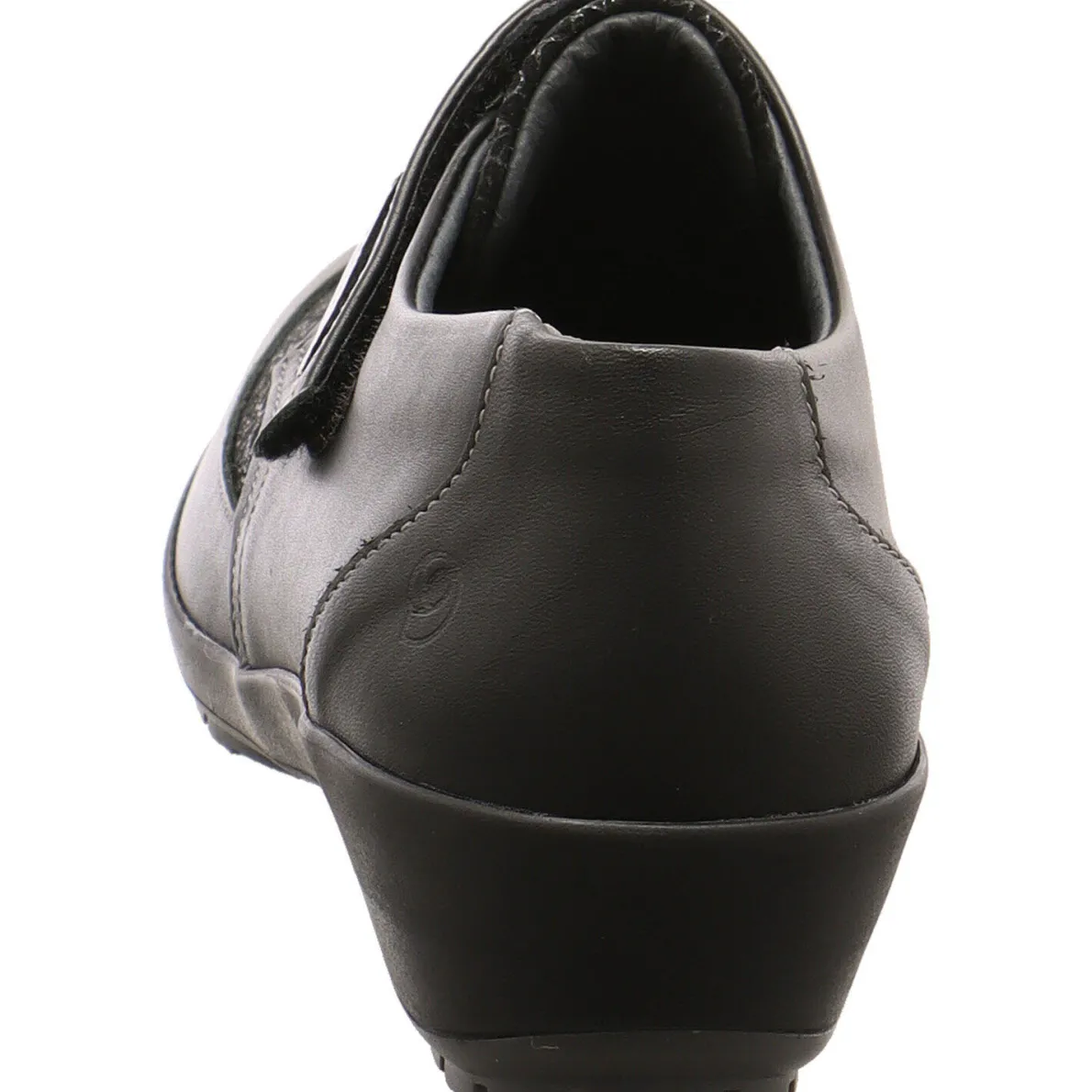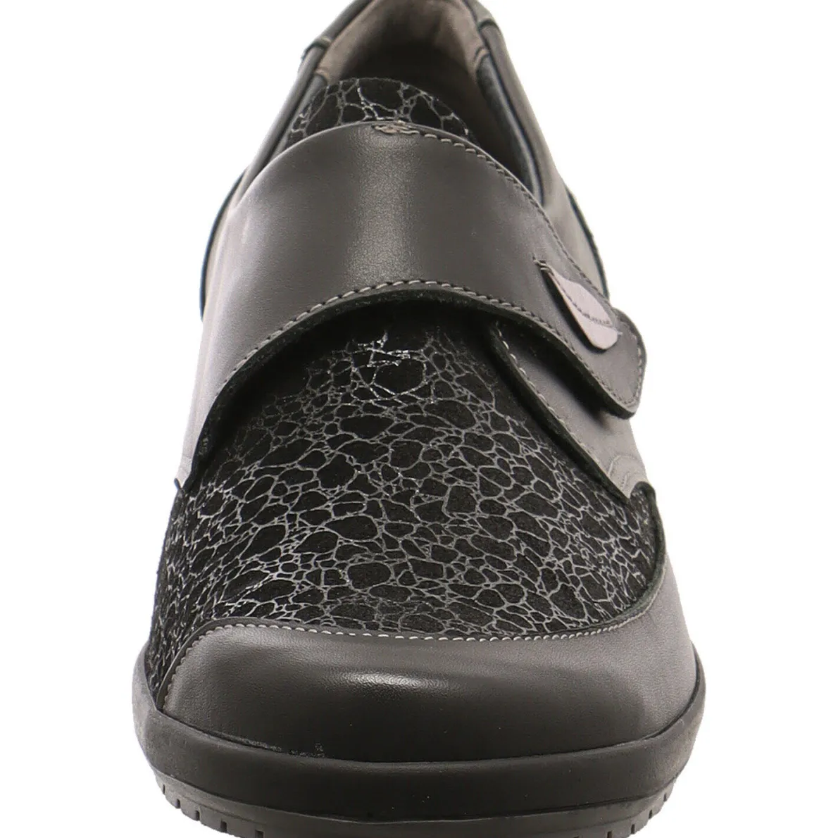Das Obermaterial aus hochwertigem Echtleder in Schwarz ist mit einem weichen Einsatz, mit einem individuellen Muster versehen. So gibt es garantiert keine Druckstellen. Das kleine Zierblatt auf dem Klettverschluss, passt perfekt zum Rest des Schuhs. Durch das schlichte Design passt dieser Schuh zu jedem Outfit.