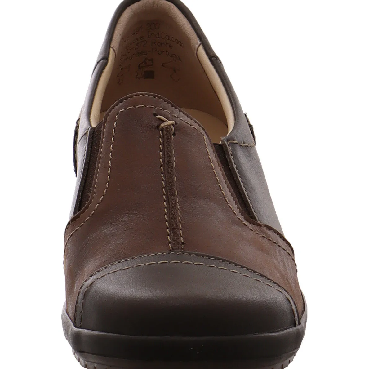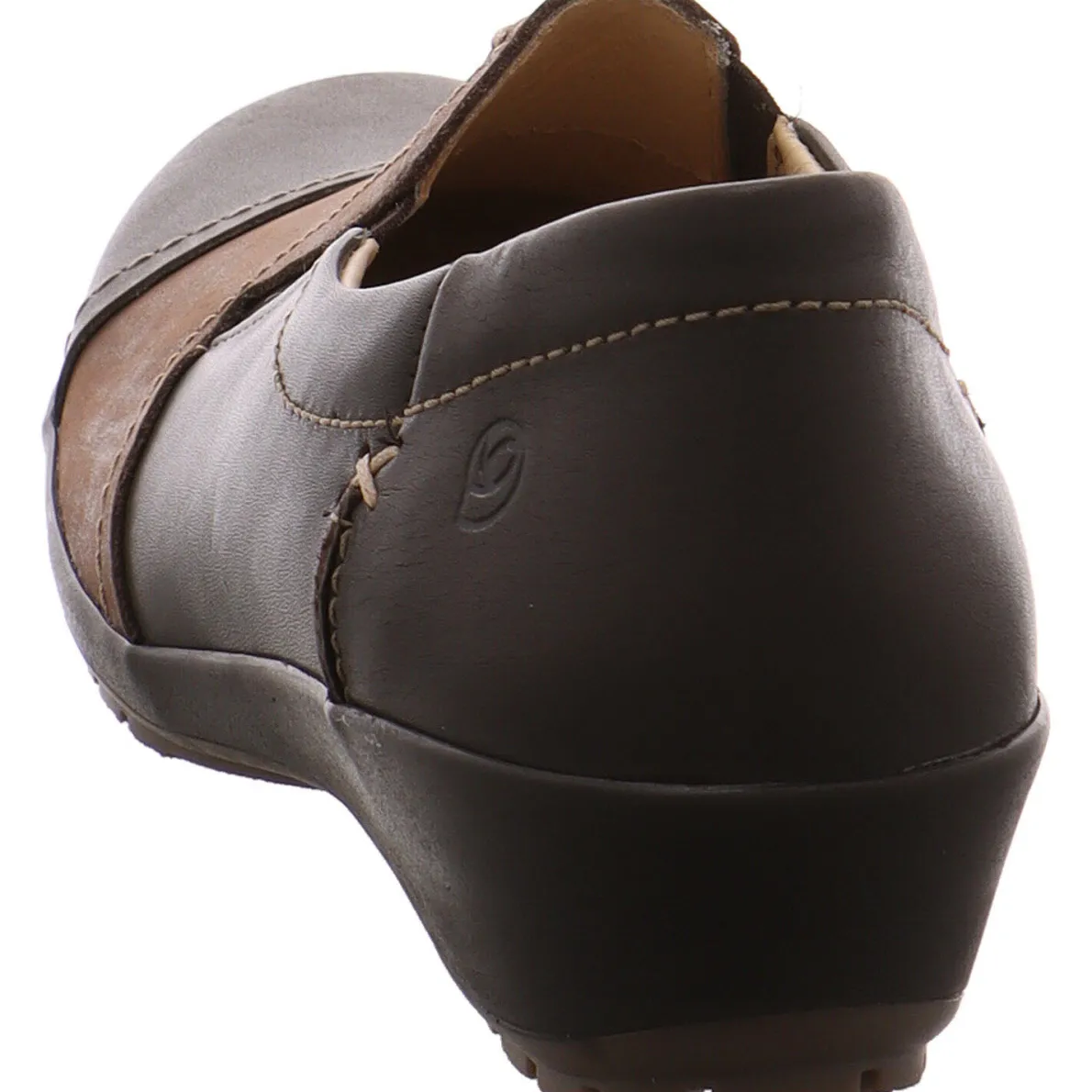 Der Keilabsatz und die leicht profilierte Synthetiklaufsohle runden das Gesamtkonzept ab.
