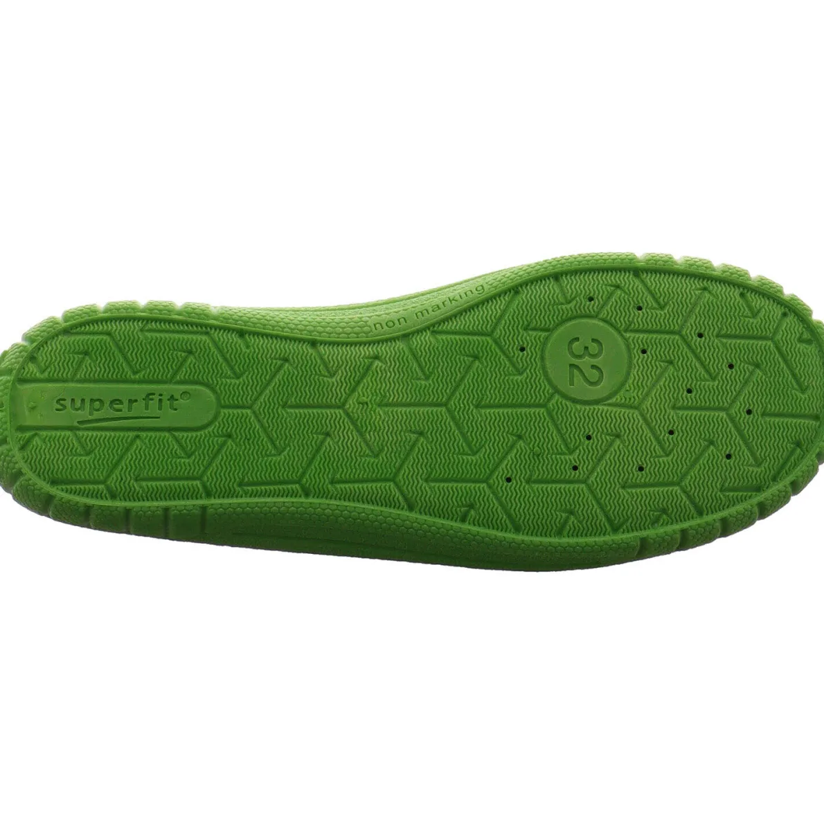 Der Klettverschluss ermöglicht ein einfaches An- und Ausziehen und die flexible Laufsohle in Grün ist perforiert und dadurch atmungsaktiv.