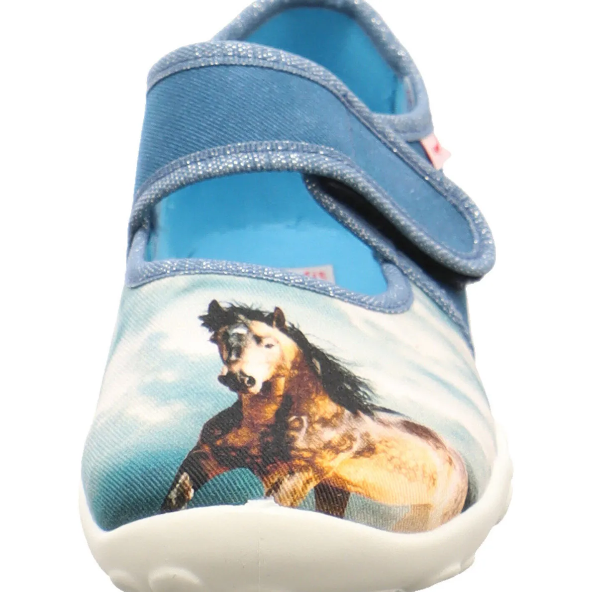Gefertigt aus Textil in Blau mit einem Pferde Print auf dem Blatt, bietet er schon kleinen Füßen besten Komfort und begeistert jedes Mädchen.