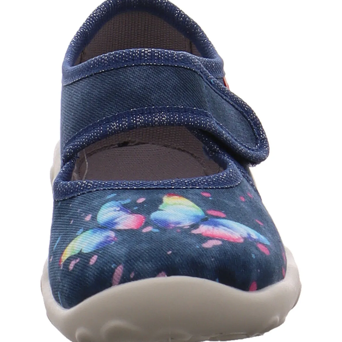 Gefertigt aus Textil in Blau mit einem Schmetterling Print auf dem Blatt, bietet er schon kleinen Füßen besten Komfort und begeistert jedes Mädchen.