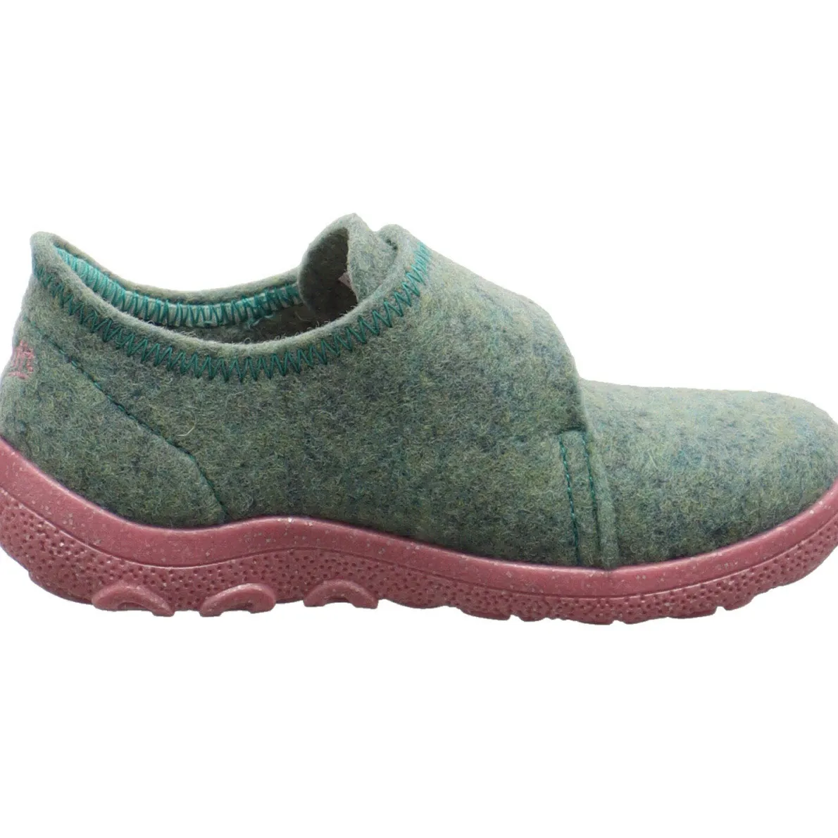 Das strapazierfähige und feuchtigkeitsabweisende Material in Grün, machen diesen Hausschuh zu einem robusten und angenehm zu tragenden Begleiter für zu Hause oder im Kindergarten. Der Klettverschluss ermöglicht ein einfaches An- und Ausziehen und die flexible Laufsohle in Rosa, ist mit Cutouts versehen und dadurch atmungsaktiv.