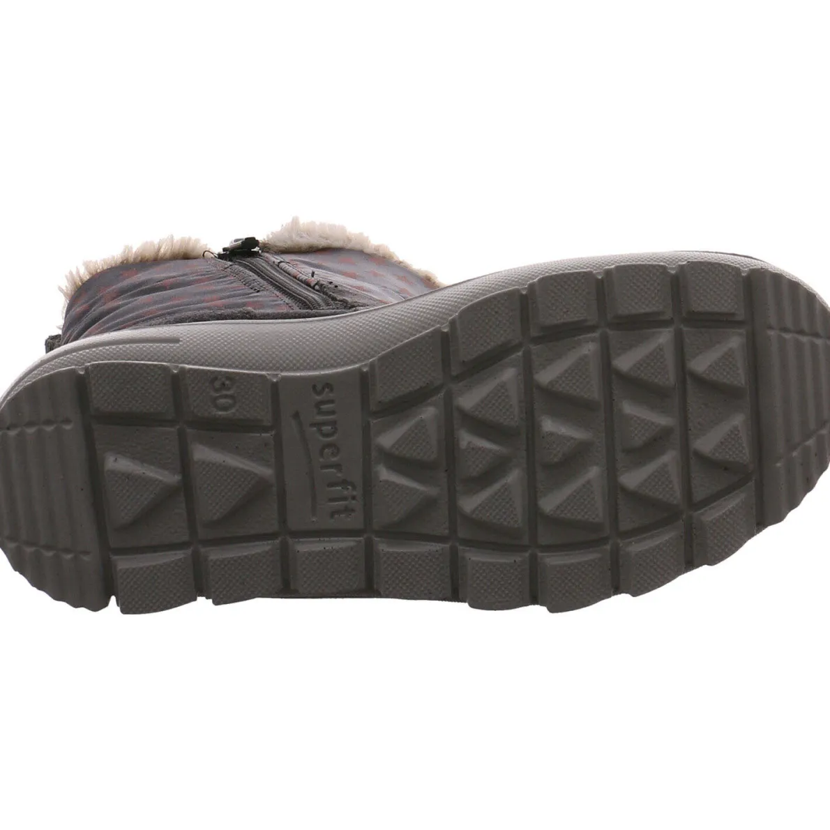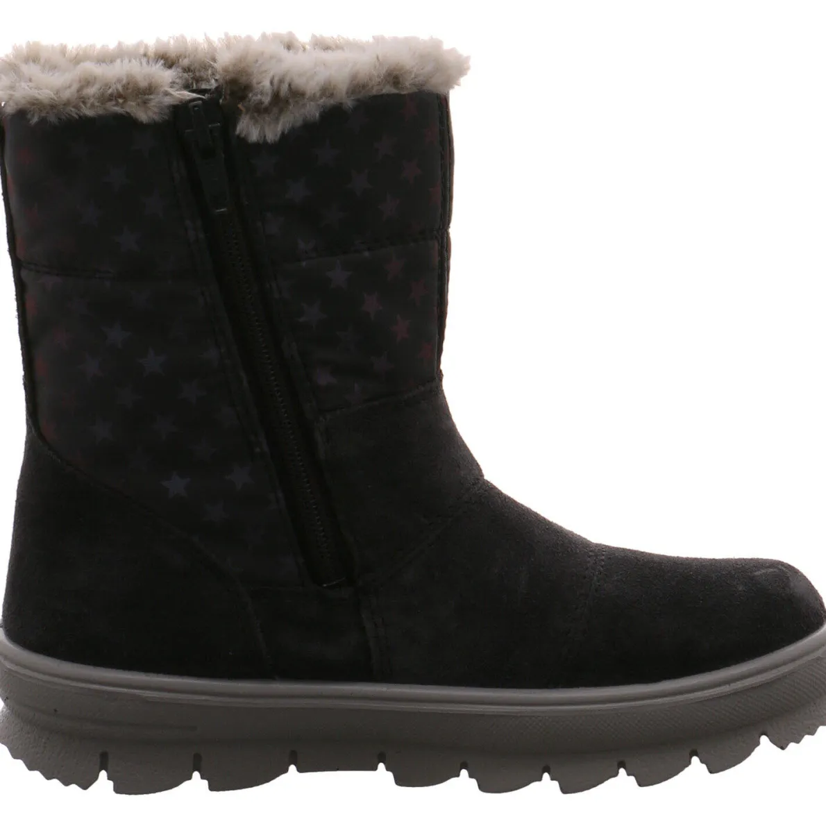 Das weiche Obermaterial in einem Mix aus Veloursleder und Textil in Grau ist am Schaft mit einem schicken Sternchenmuster versehen.