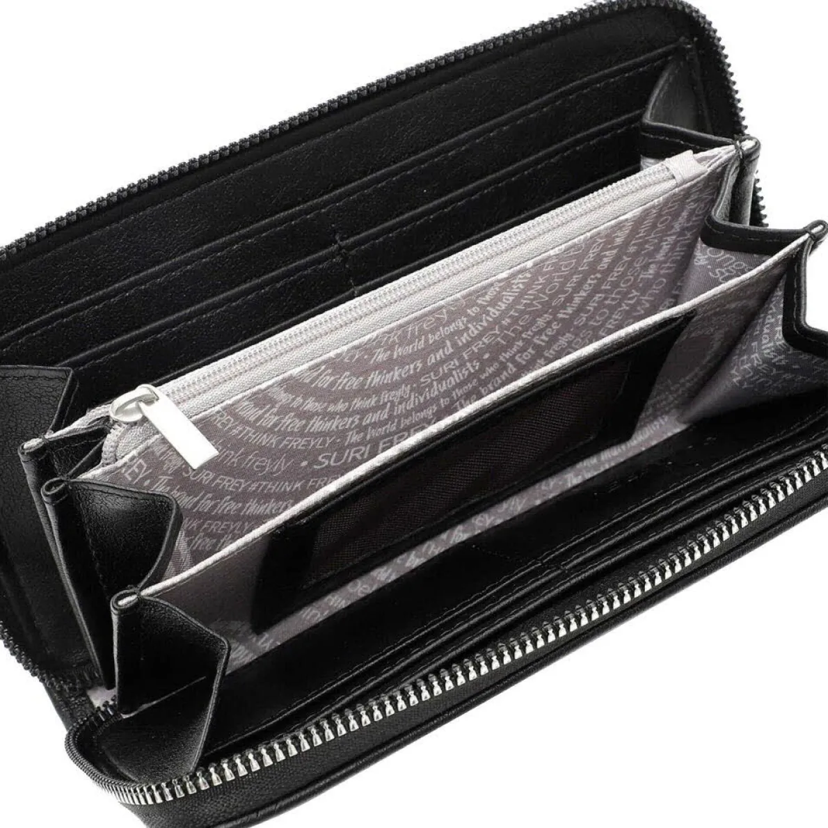 Das Portemonnaie lässt sich durch einen umlaufenden Reißverschluss öffnen und schließen. Das Innenleben besteht aus großen Fächern für Geldscheine und zahlreichen kleinen Fächern für Karten und Ähnliches. Für Kleingeld verfügt die Langbörse über ein separates Fach mit Reißverschluss.